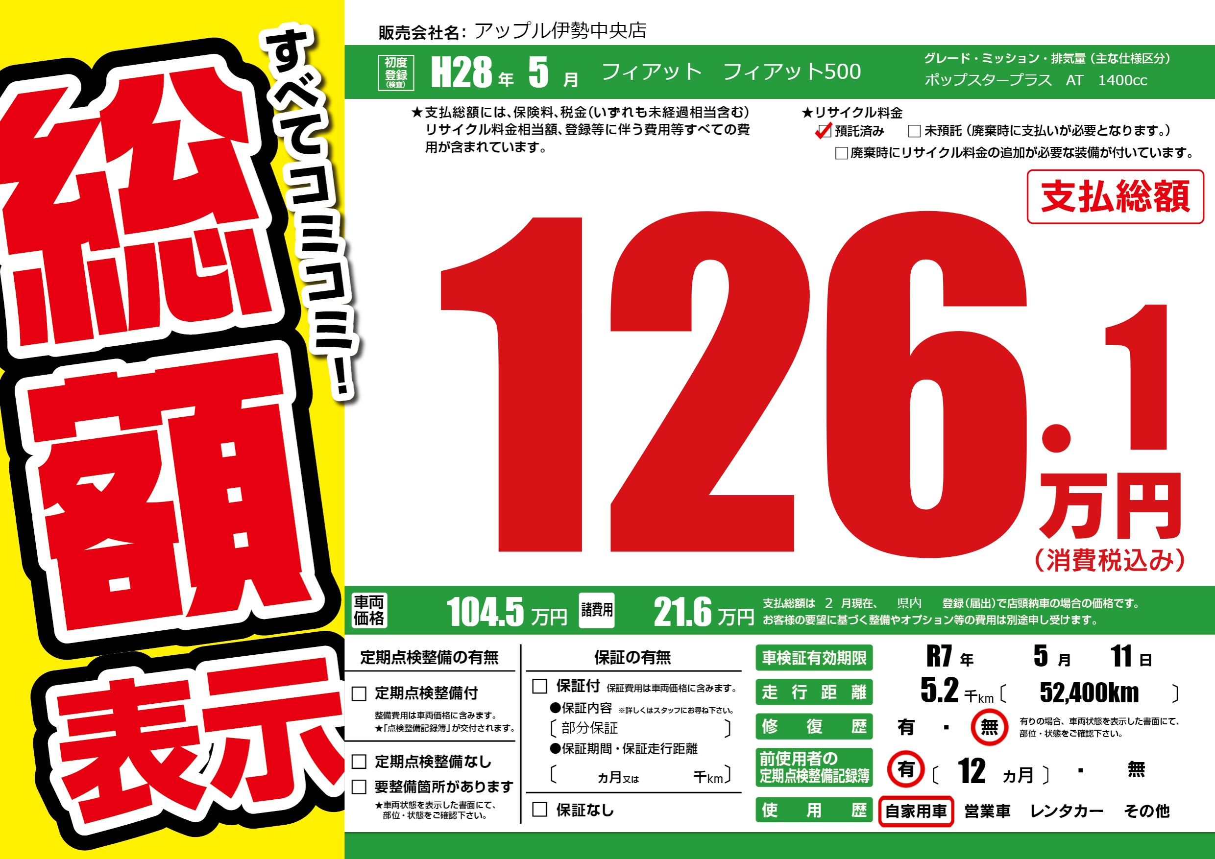 | 車名 | フィアット フィアット500 | グレード ミッション 排気量 |