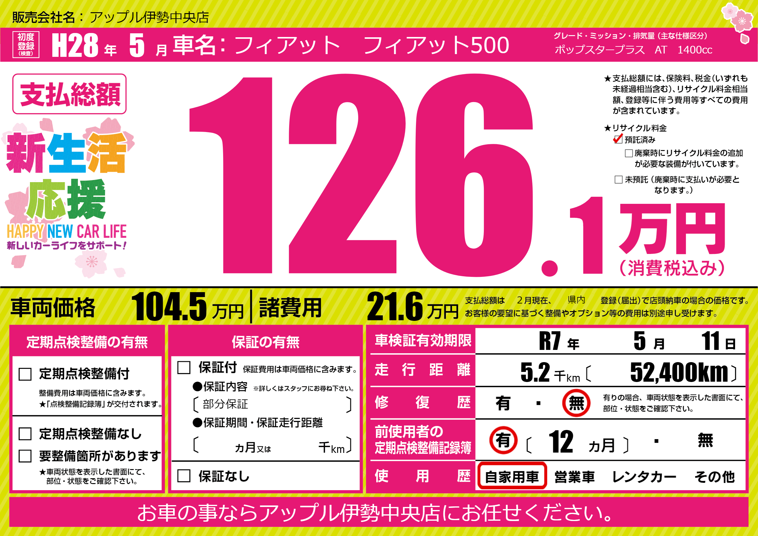| 車名 | フィアット フィアット500 | グレード ミッション 排気量 |