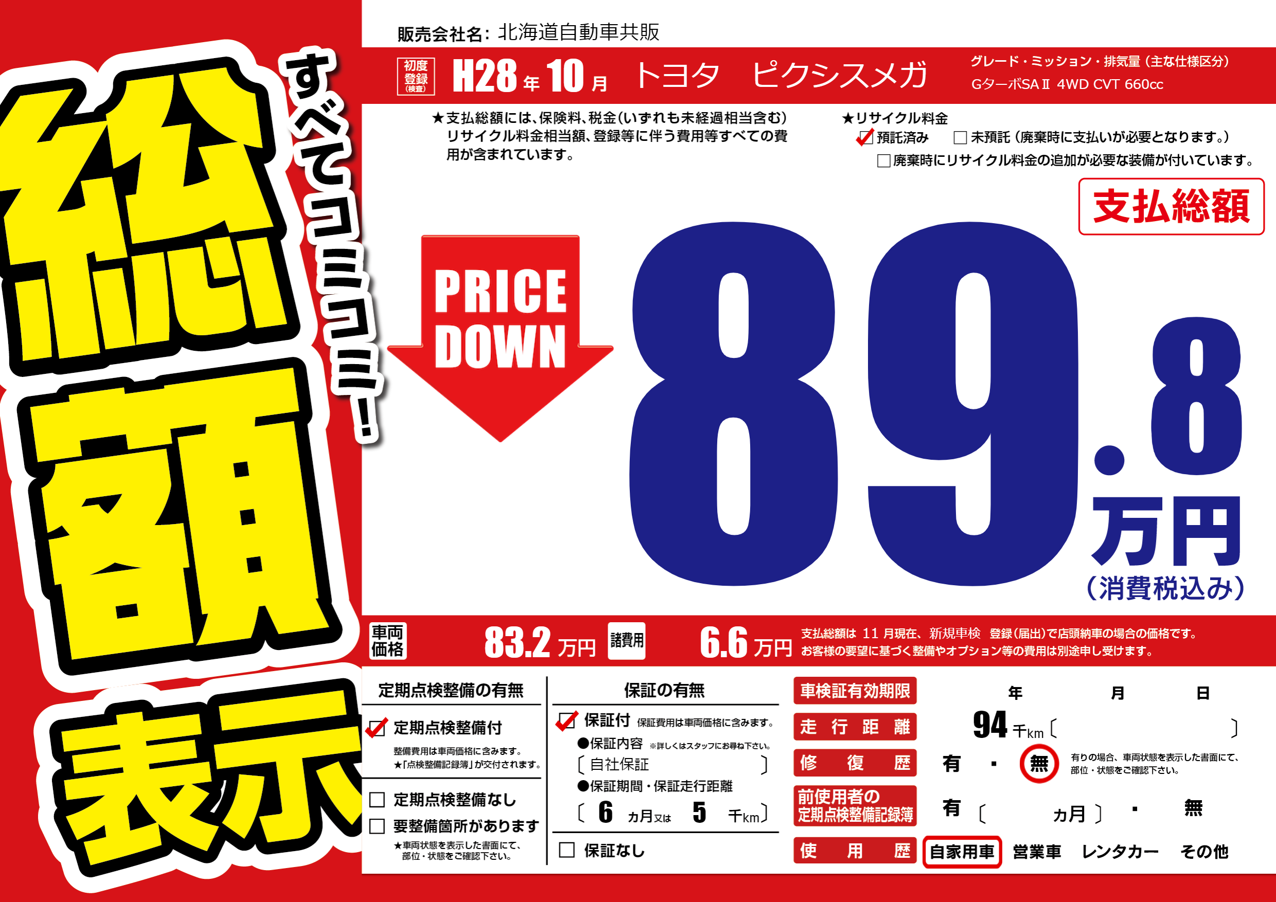| 走行キロ | 9.4万km | 初年度登録 | H28年10月 |