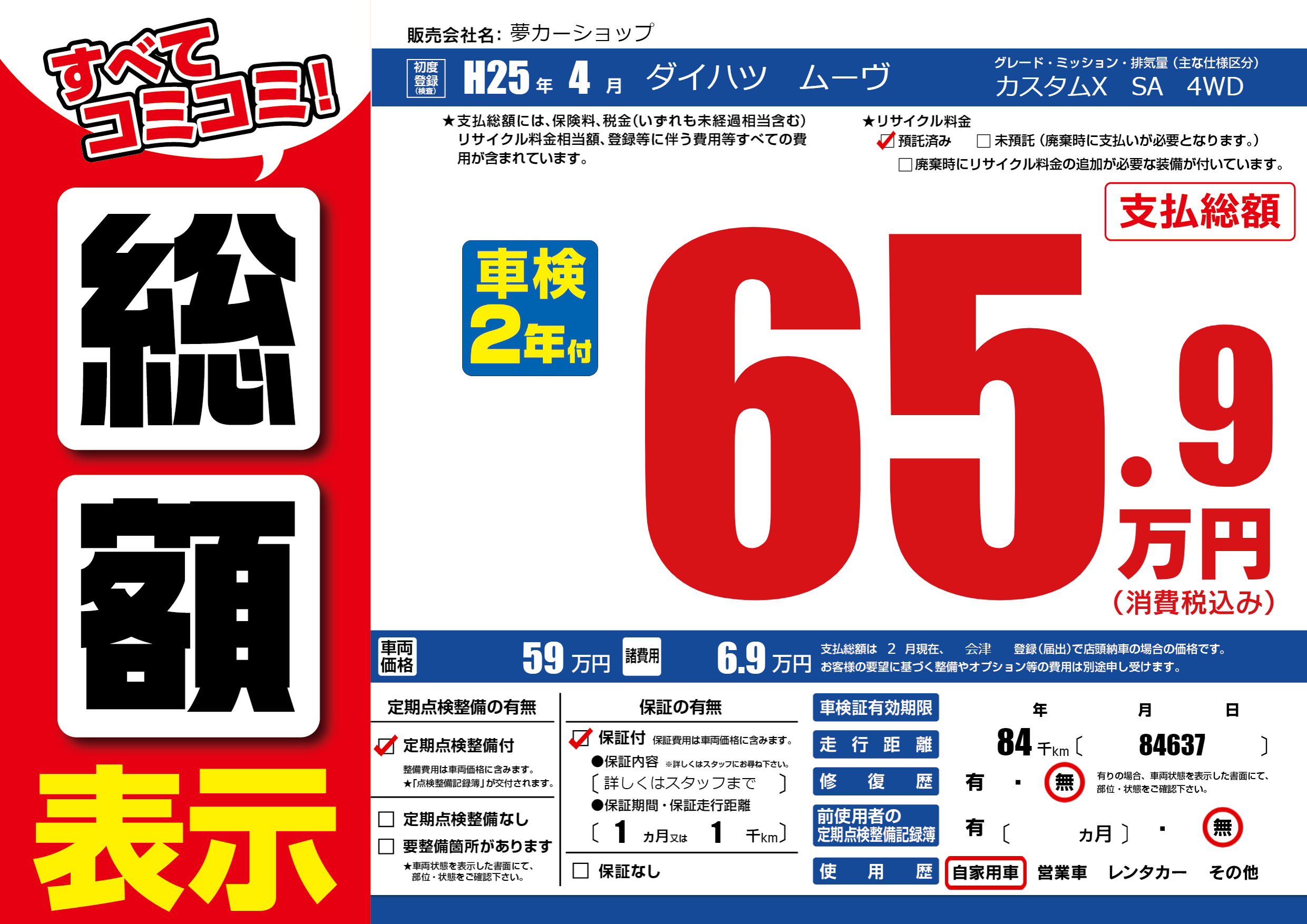 | 走行キロ | 8.4万km | 初年度登録 | H25年4月 |