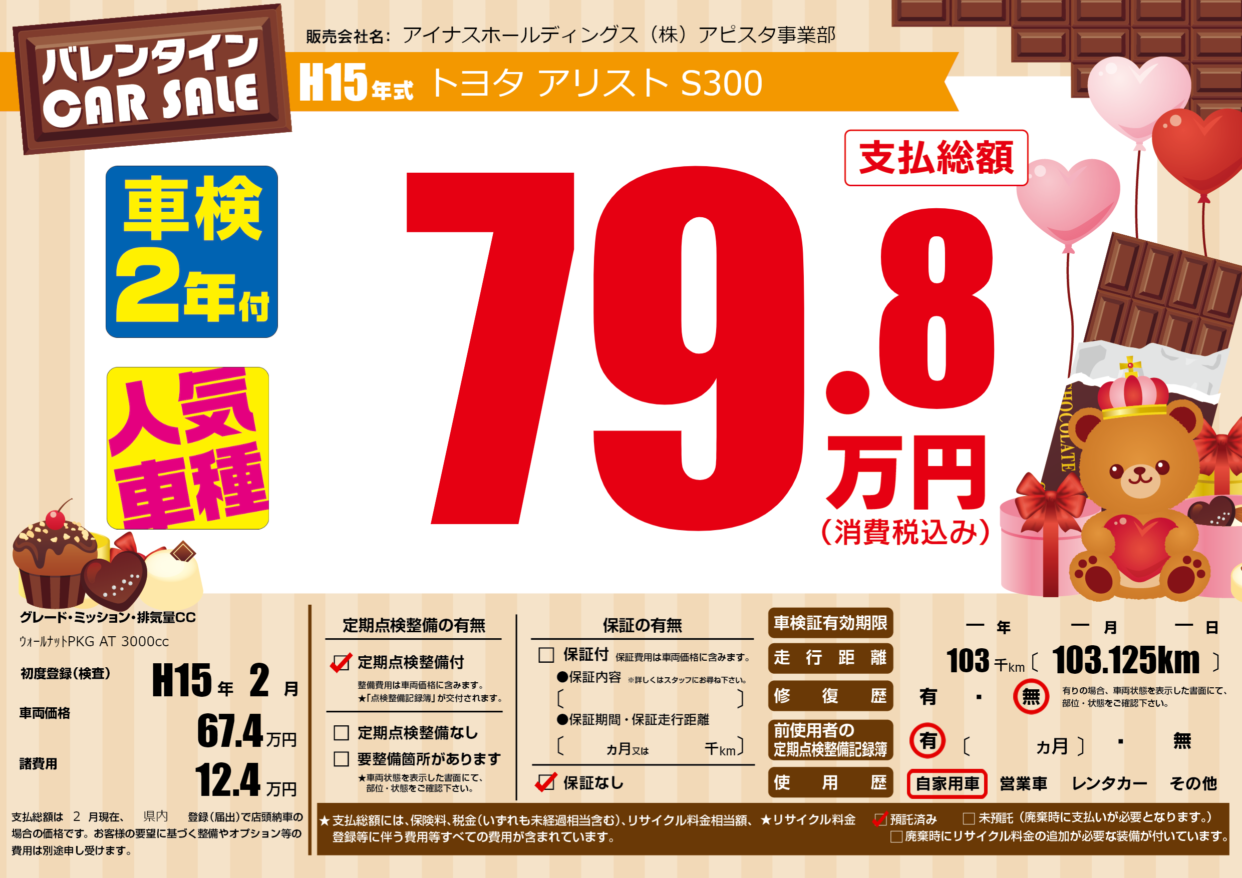 | 車名 | トヨタ アリスト S300 | グレード ミッション 排気量 |