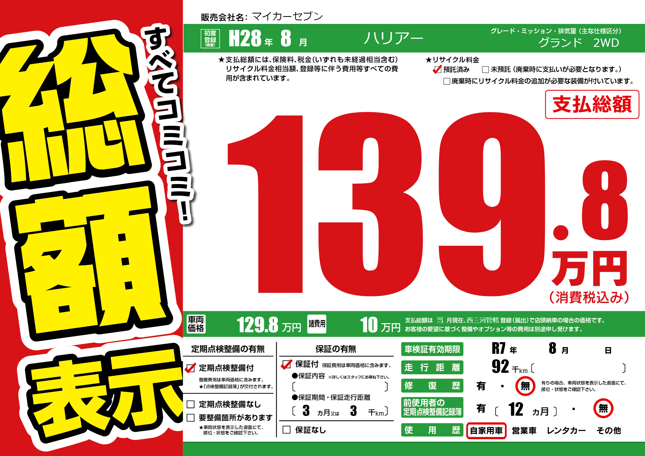 | 走行キロ | 9.2万km | 初年度登録 | H28年8月 |
