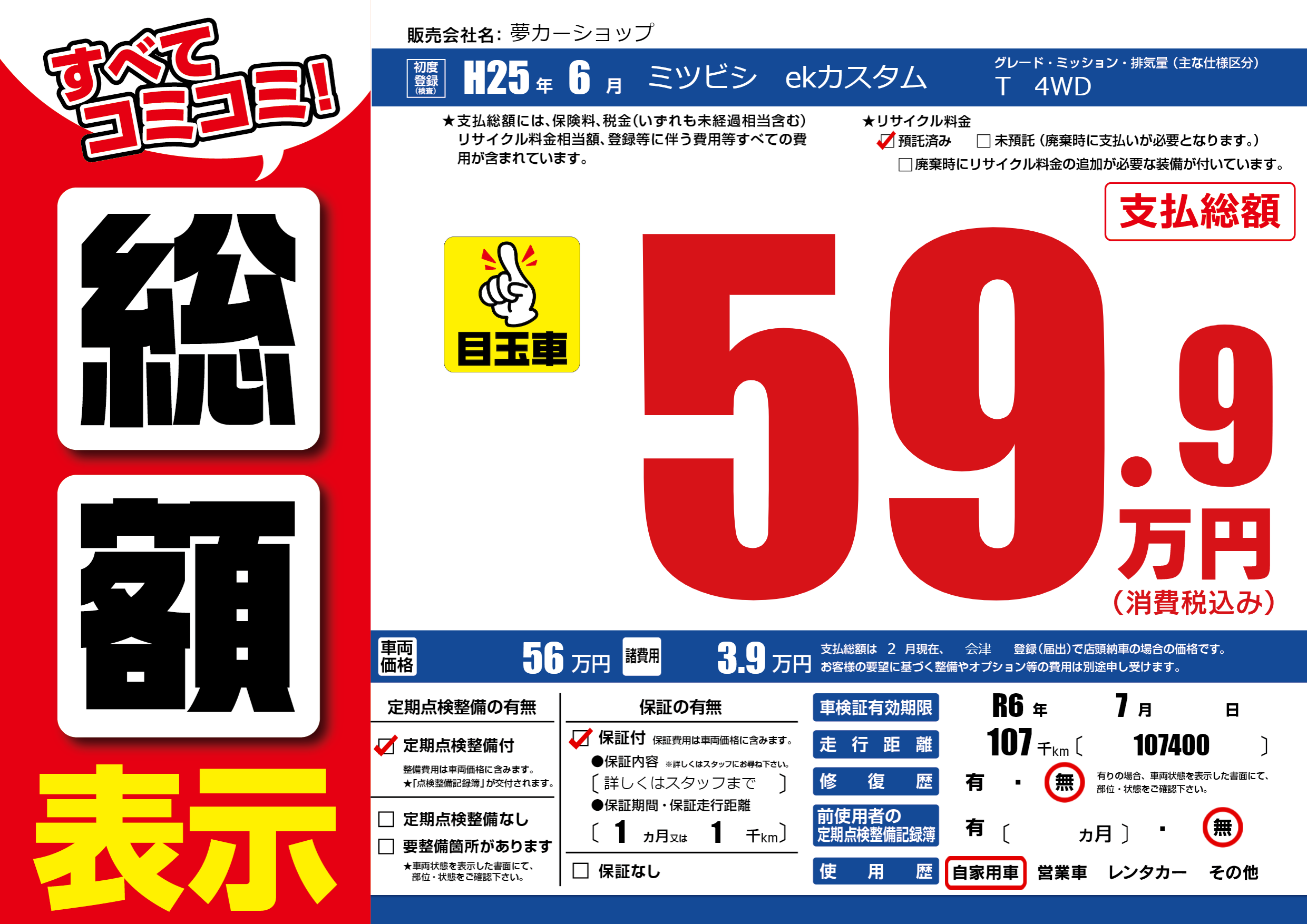 | 車名 | ミツビシ ekカスタム | グレード ミッション 排気量 |