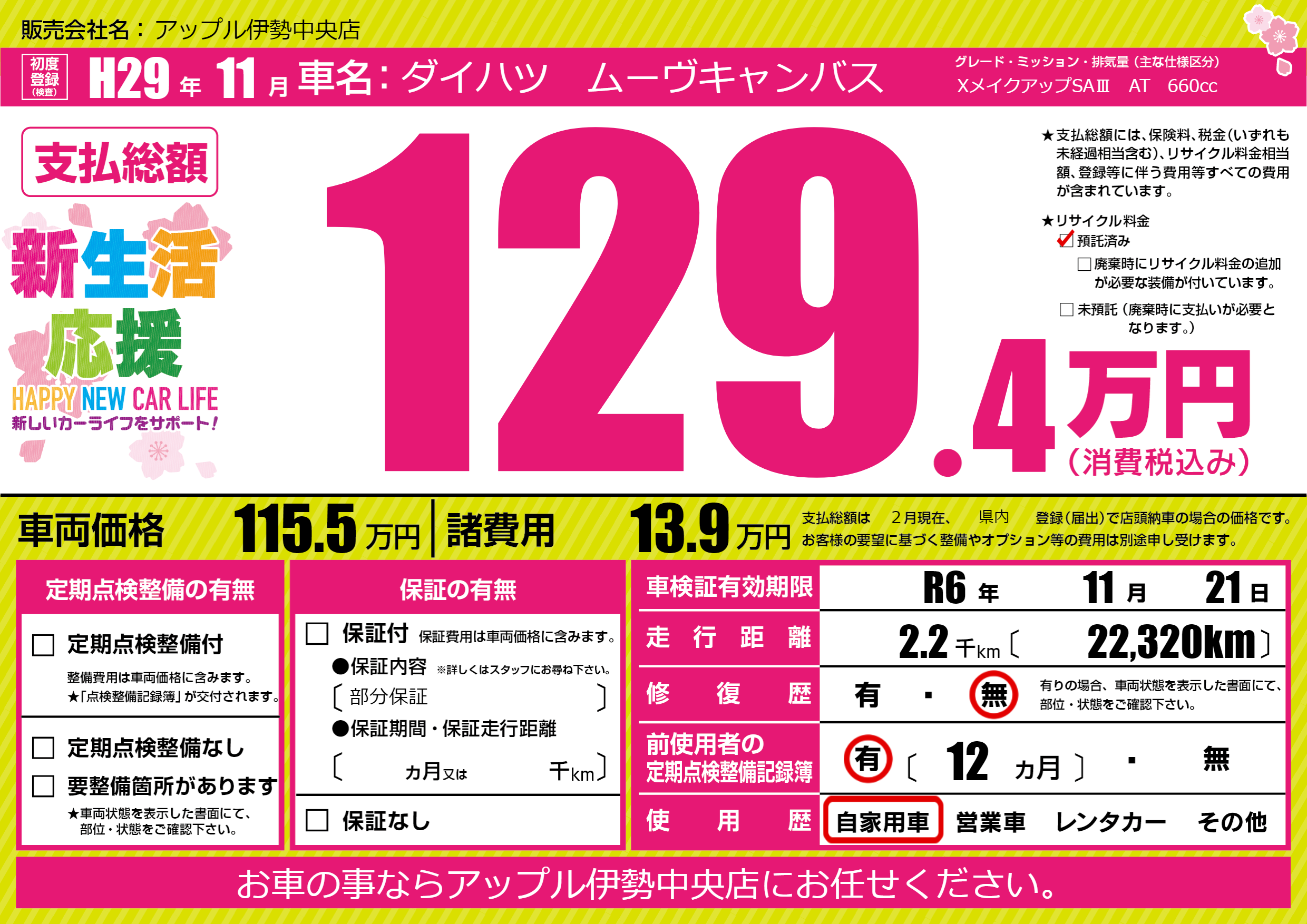 | 車名 | ダイハツ ムーヴキャンバス | グレード ミッション 排気量 |