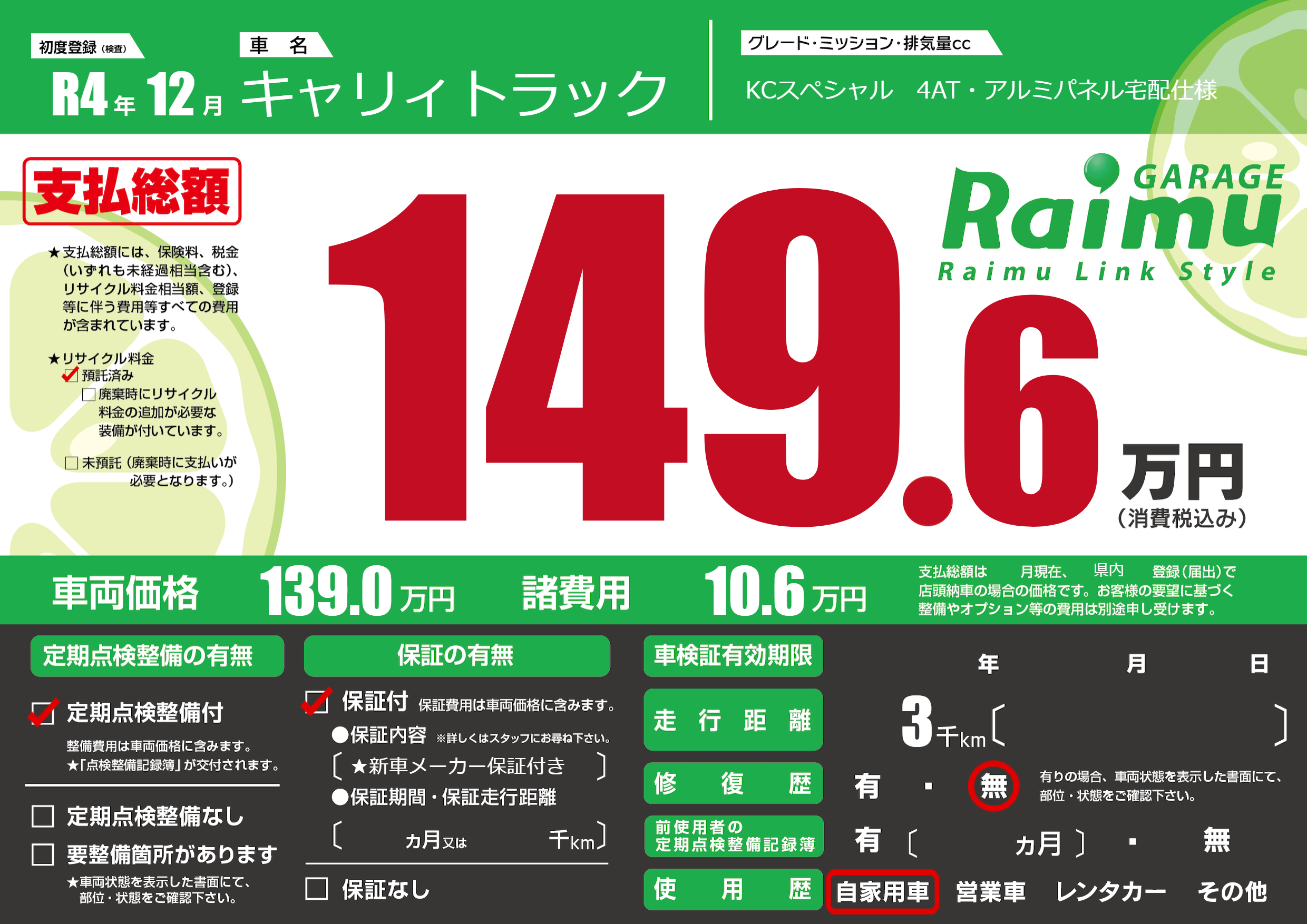 | 走行キロ | 0.3万km | 初年度登録 | R4年12月 |