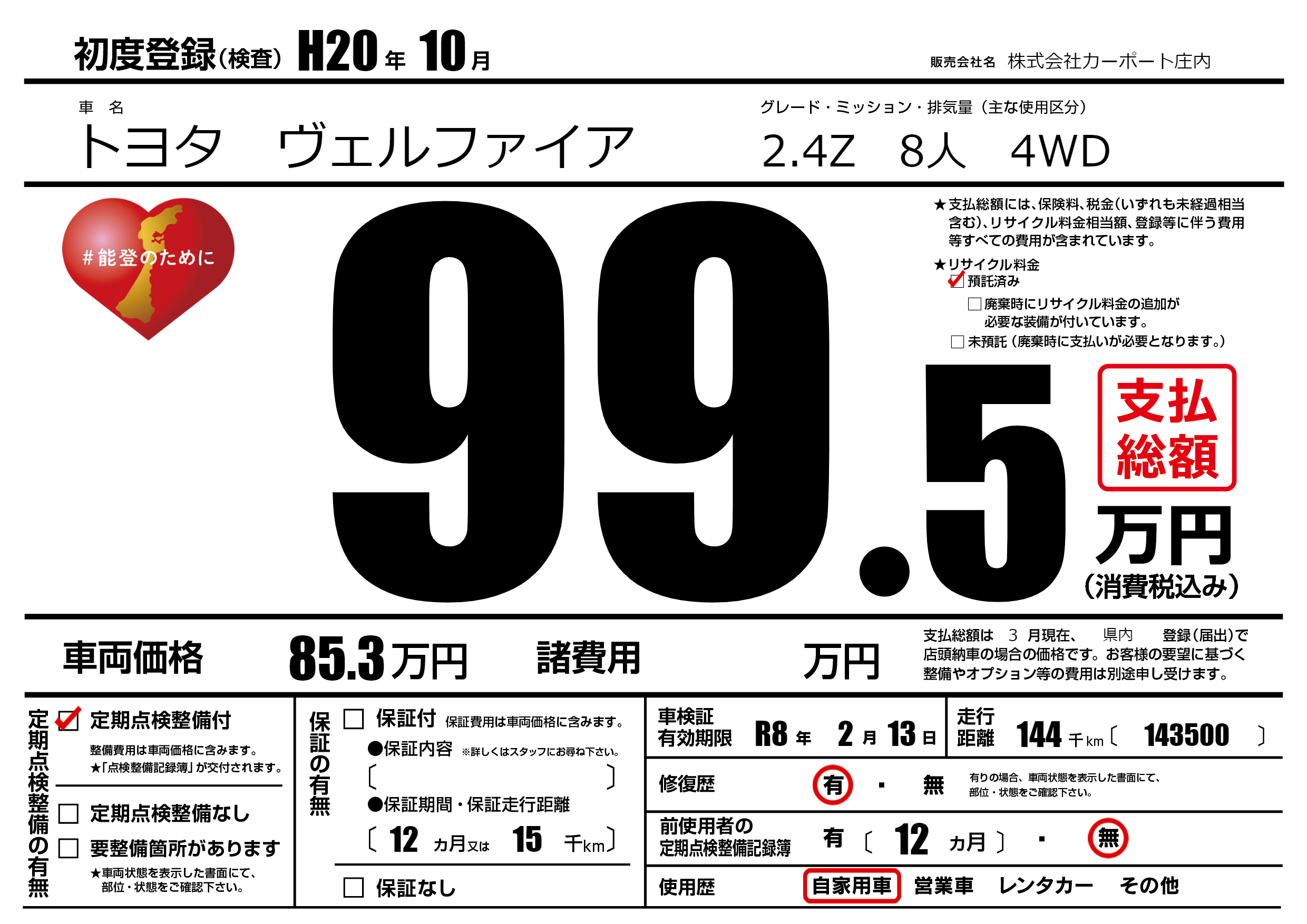 | 走行キロ | 14.4万km | 初年度登録 | H20年10月 |