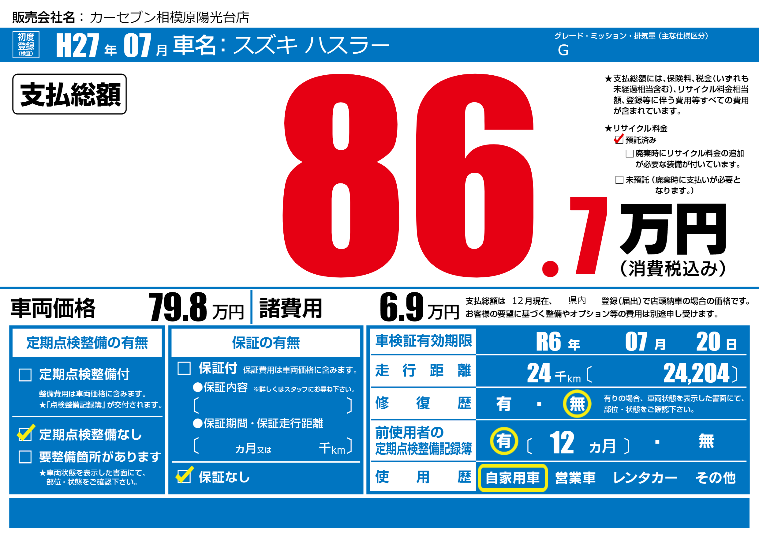 | 車名 | スズキ ハスラー | グレード ミッション 排気量 |