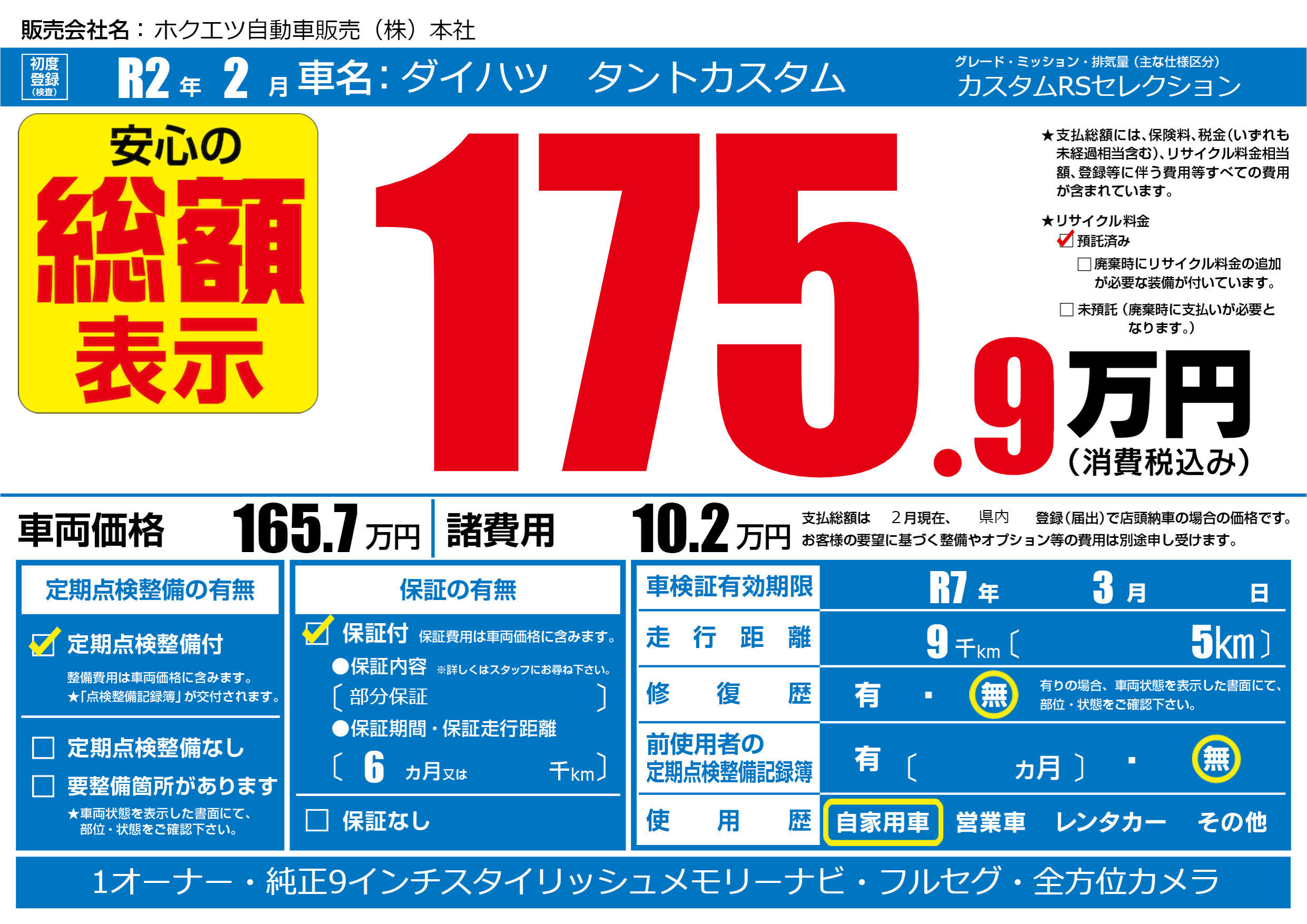 | 走行キロ | 0.9万km | 初年度登録 | R2年2月 |