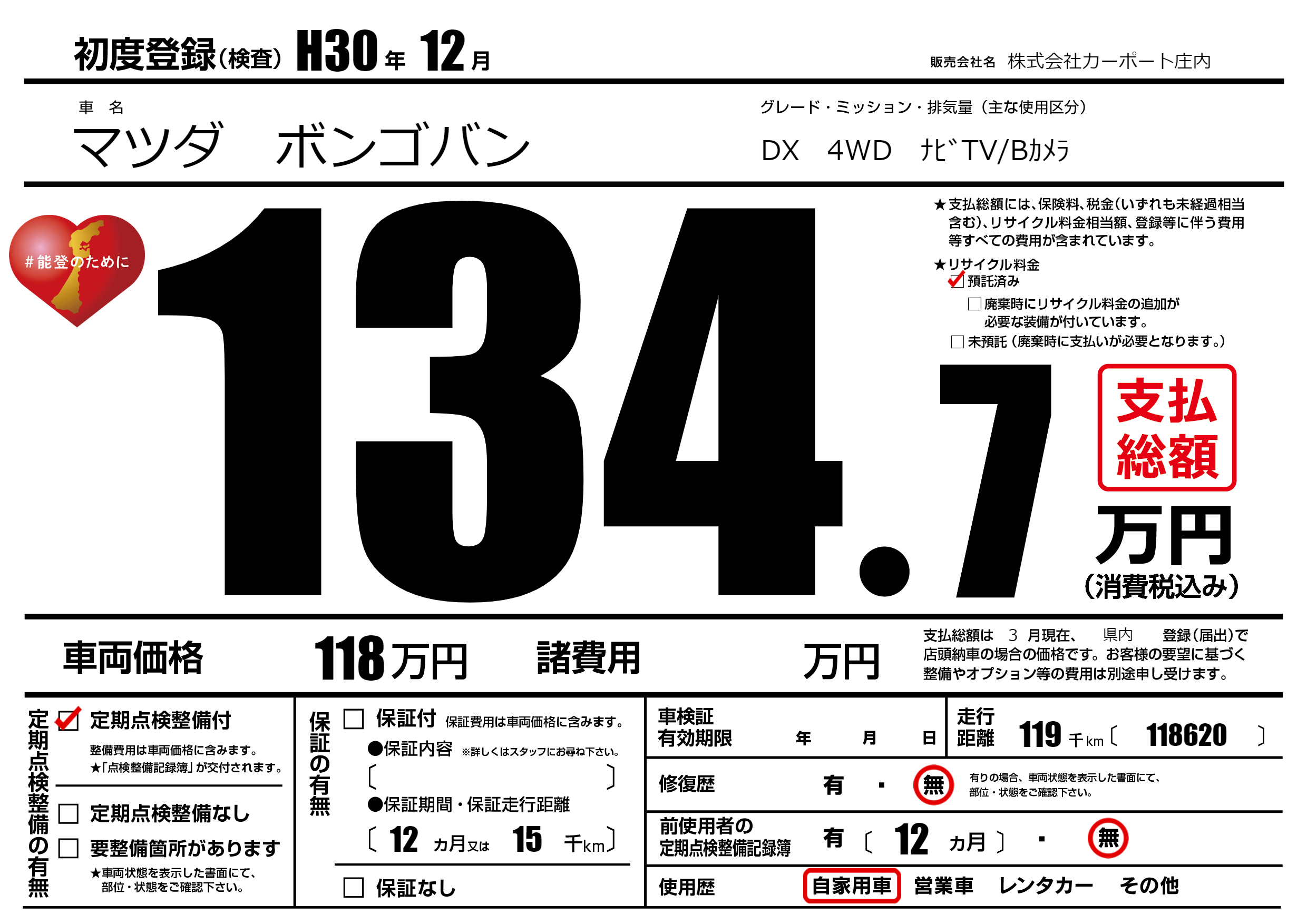 | 走行キロ | 11.9万km | 初年度登録 | H30年12月 |