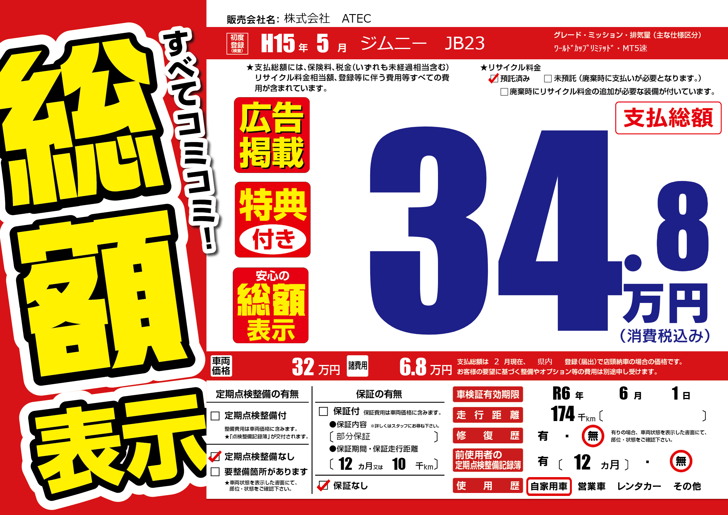 | 車名 | ジムニー JB23 | グレード ミッション 排気量 |