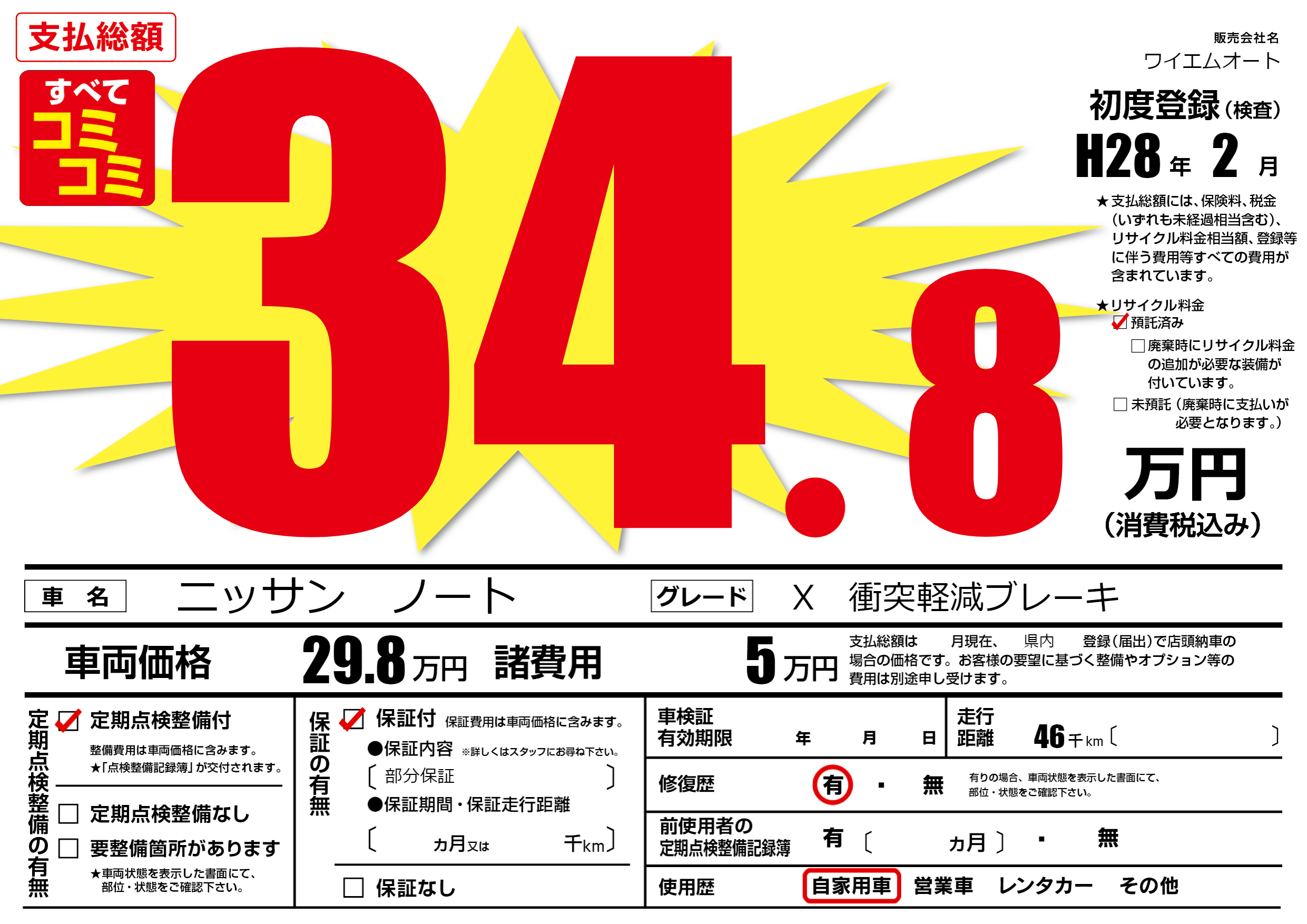 | 走行キロ | 4.6万km | 初年度登録 | H28年2月 |