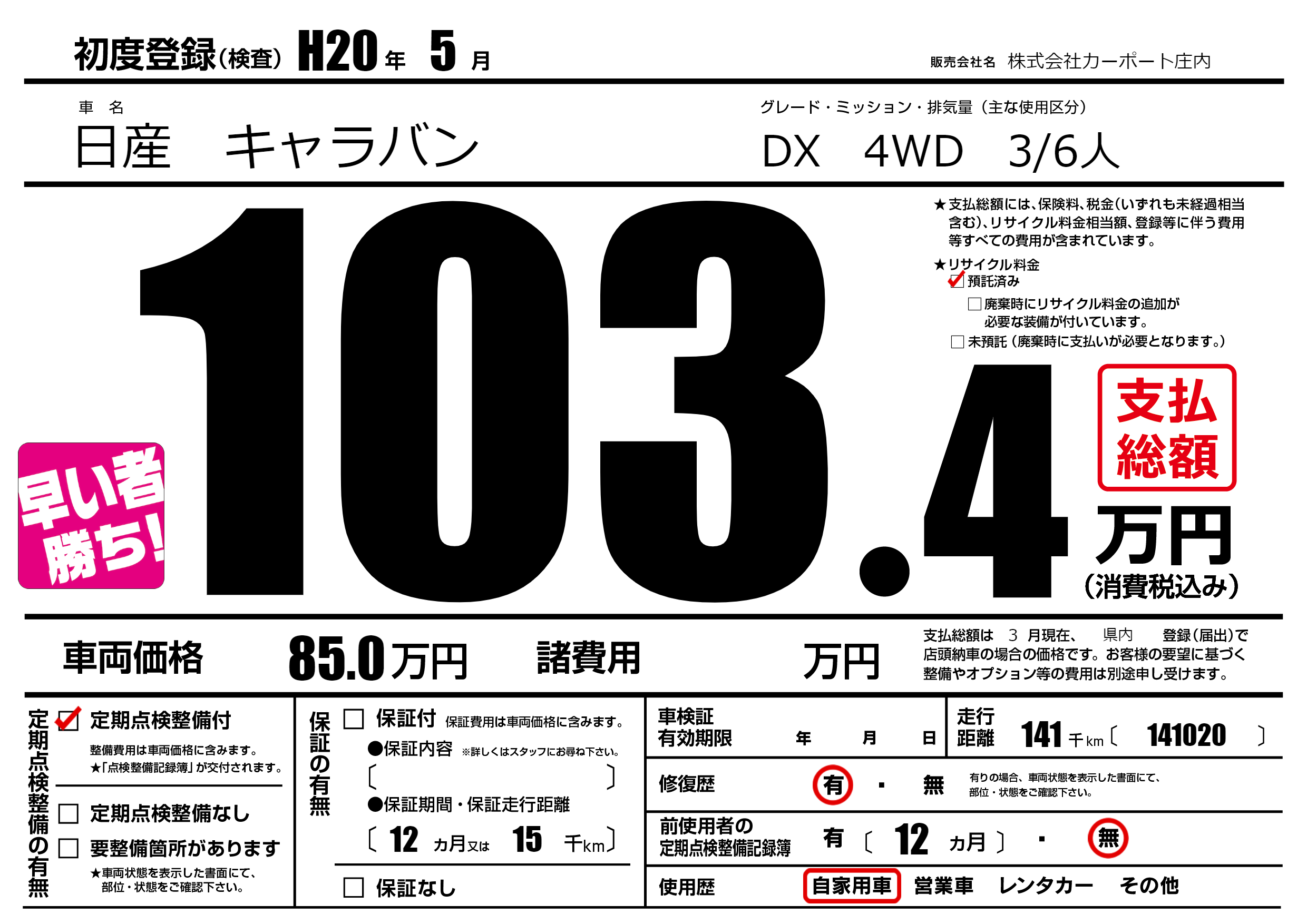 | 車名 | 日産 キャラバン | グレード ミッション 排気量 |