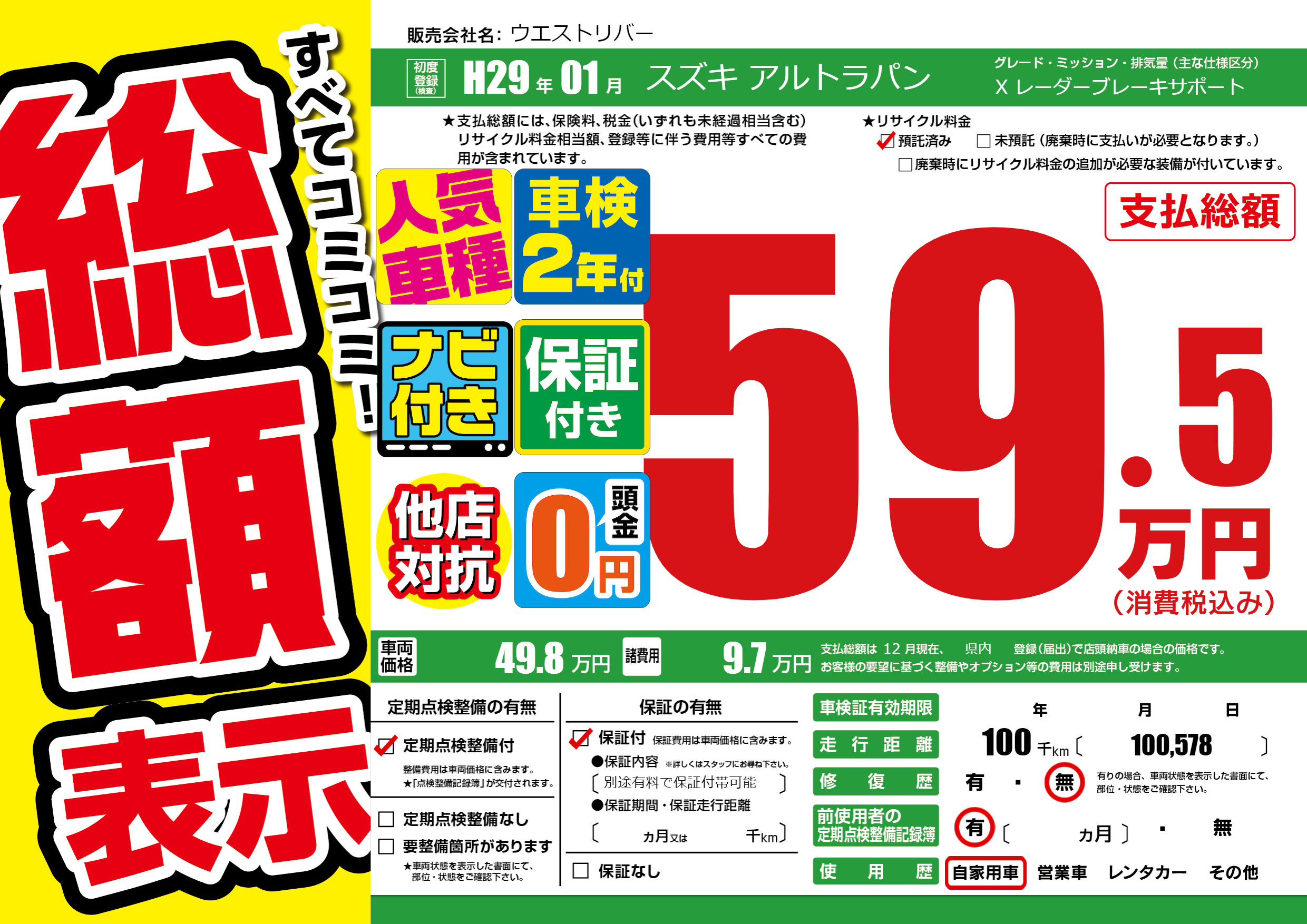 | 走行キロ | 10万km | 初年度登録 | H29年01月 |