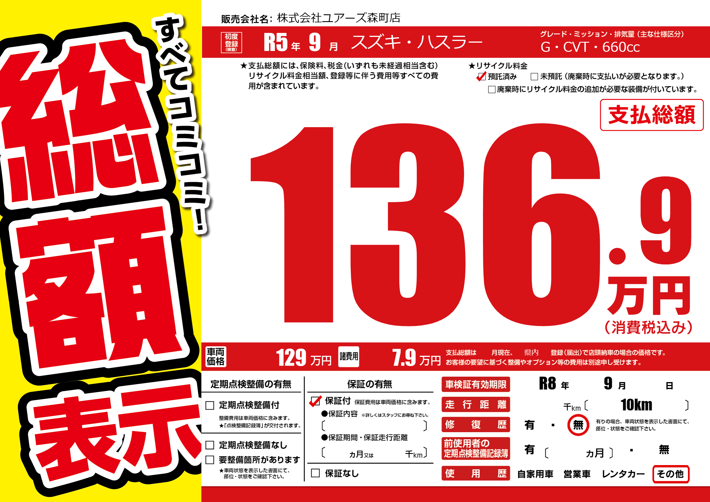 | 車名 | スズキ・ハスラー | グレード ミッション 排気量 |