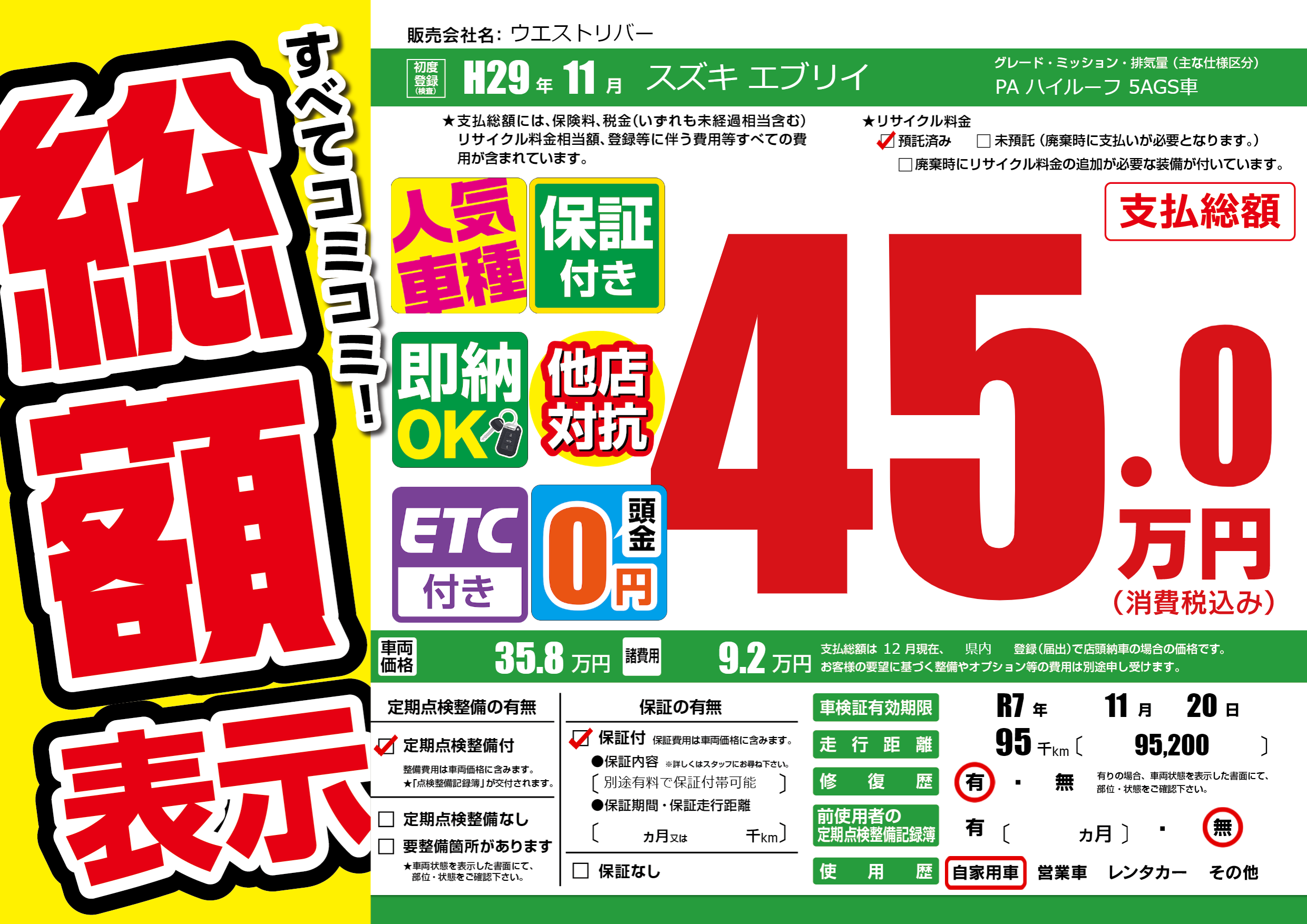 | 走行キロ | 9.5万km | 初年度登録 | H29年11月 |