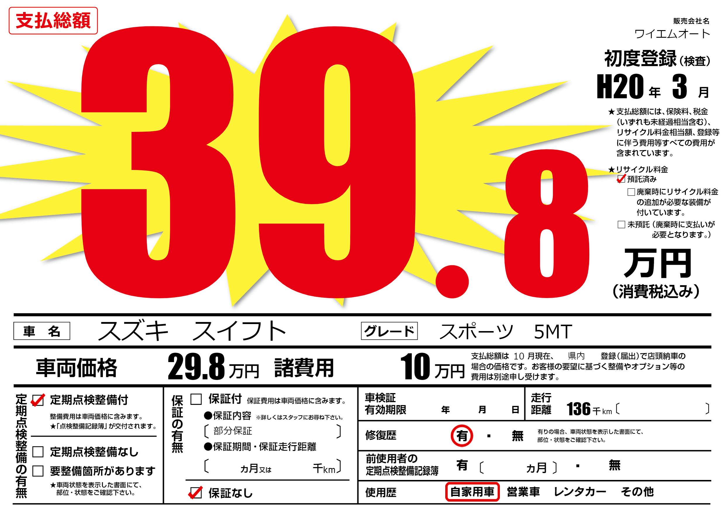 | 車名 | スズキ スイフト | グレード ミッション 排気量 |