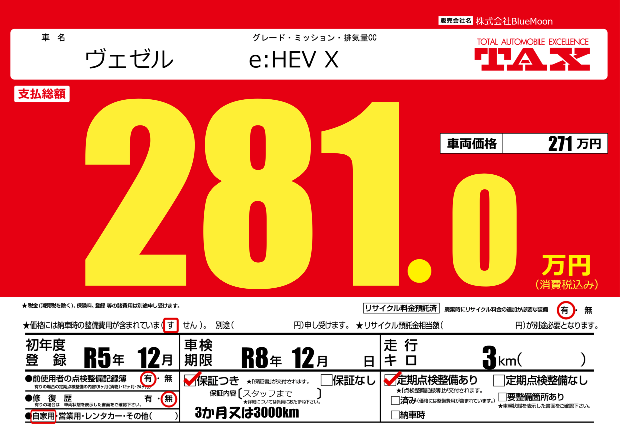 | 走行キロ | 0.3万km | 初年度登録 | R5年12月 |