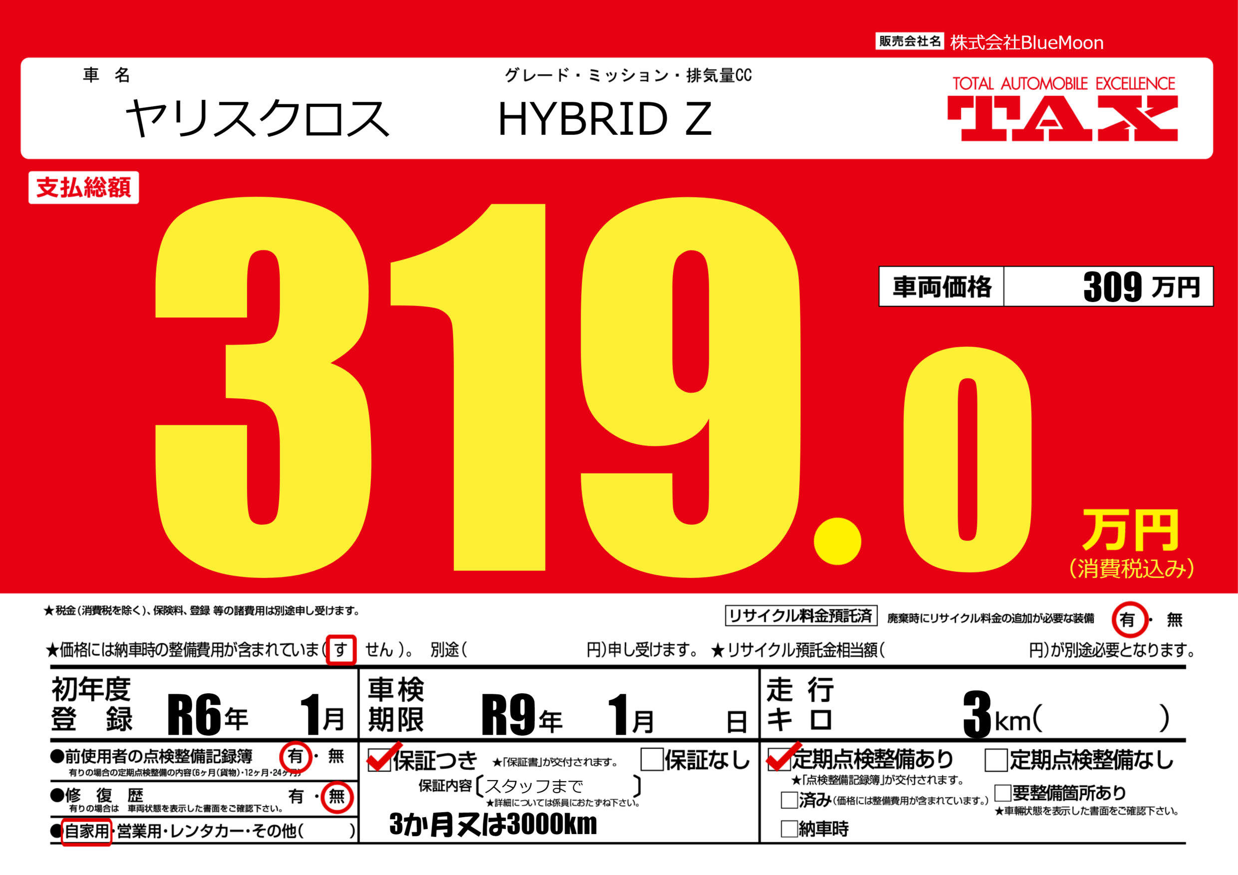 | 走行キロ | 0.3万km | 初年度登録 | R6年1月 |