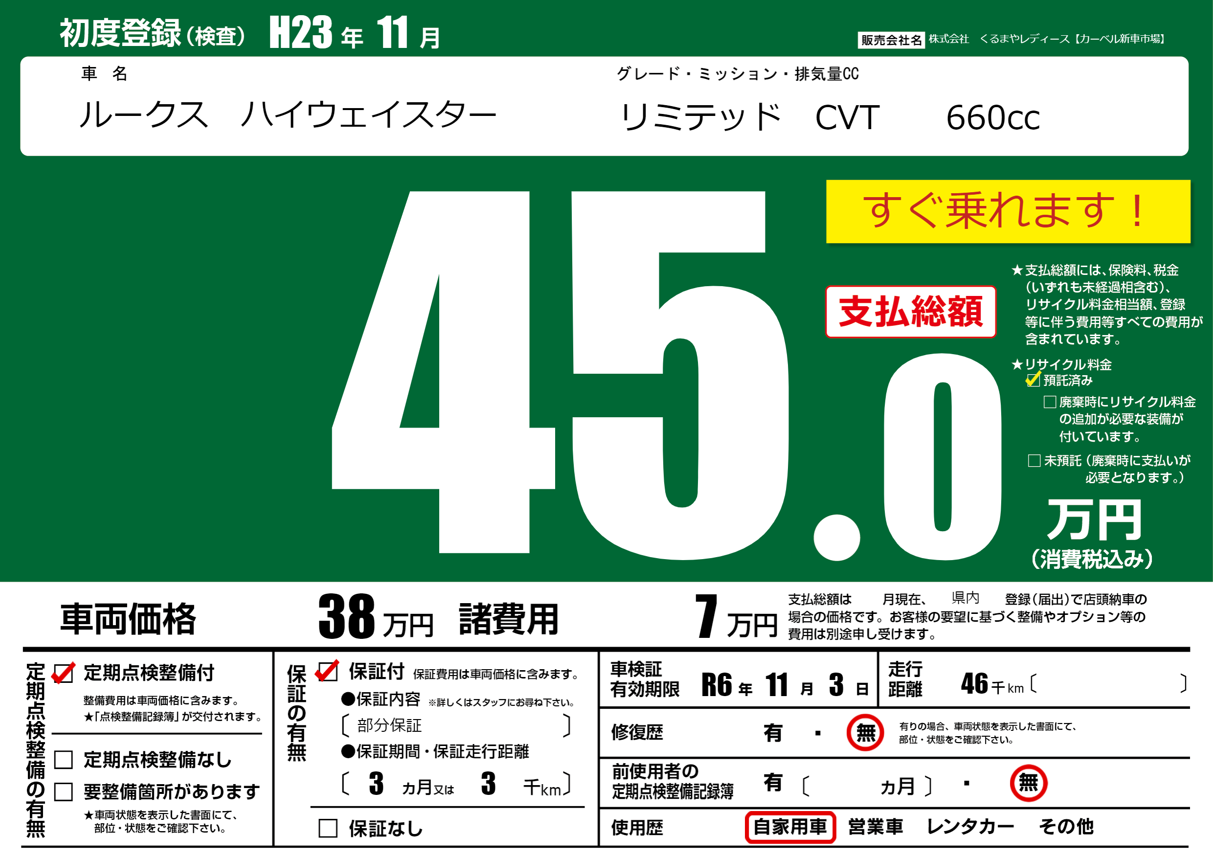 | 走行キロ | 4.6万km | 初年度登録 | H23年11月 |