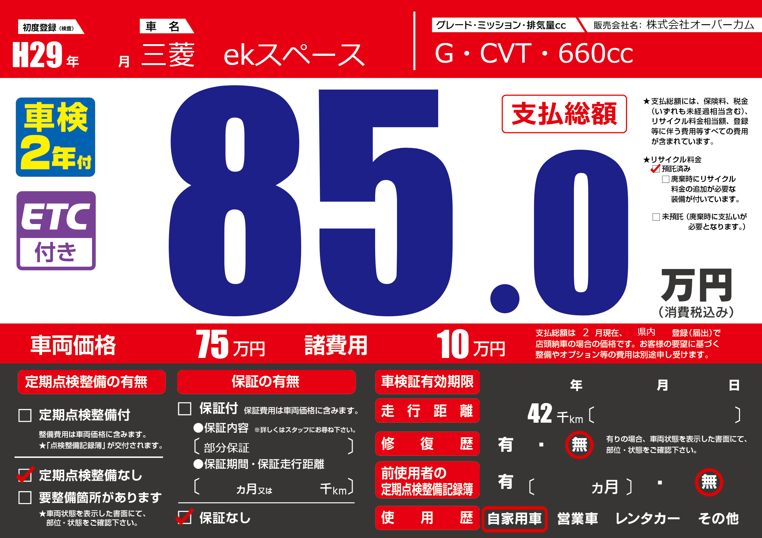 保証なし 保証内容(部分保証) ---ヶ月または()千kmまで |