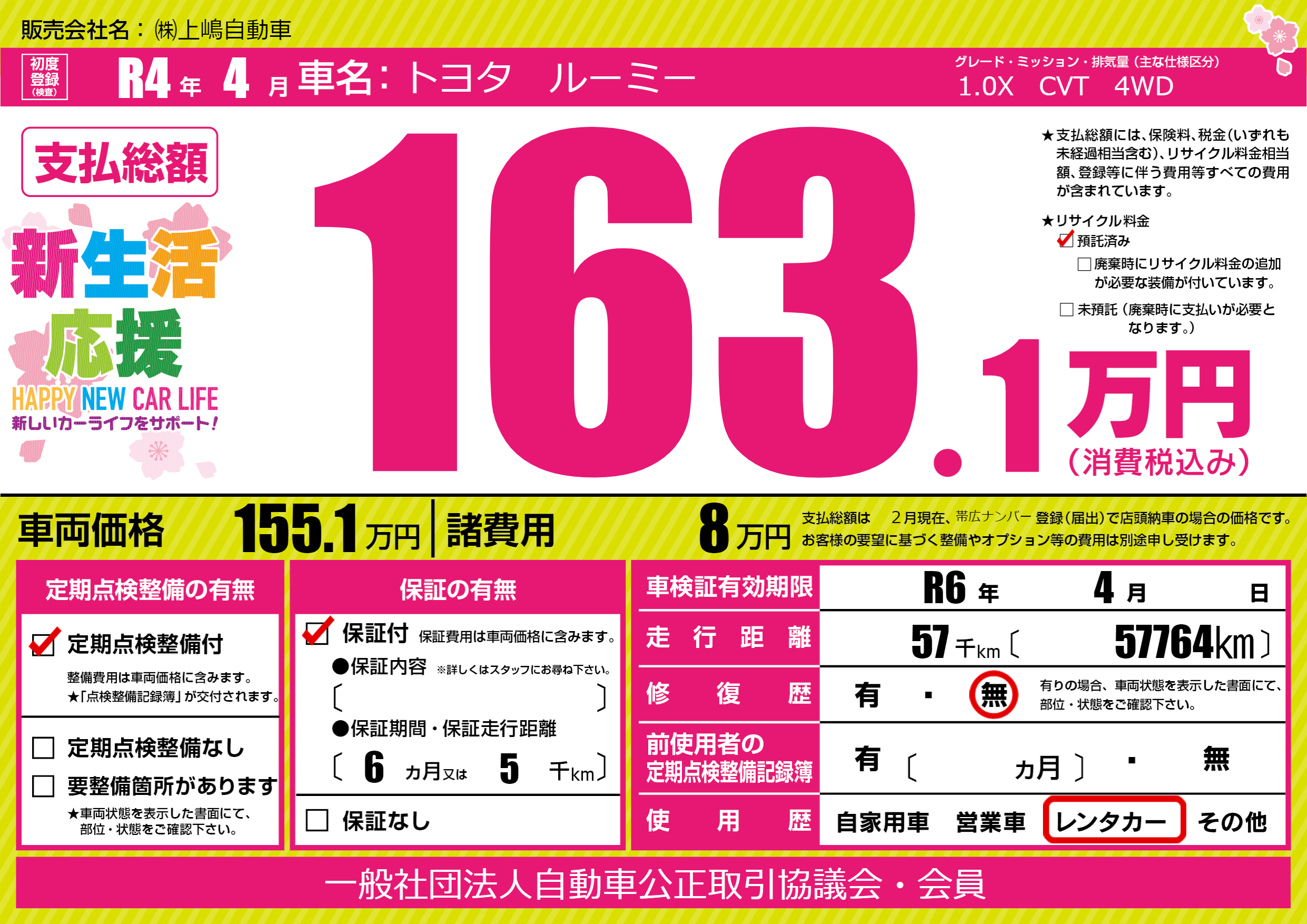 | 走行キロ | 5.7万km | 初年度登録 | R4年4月 |