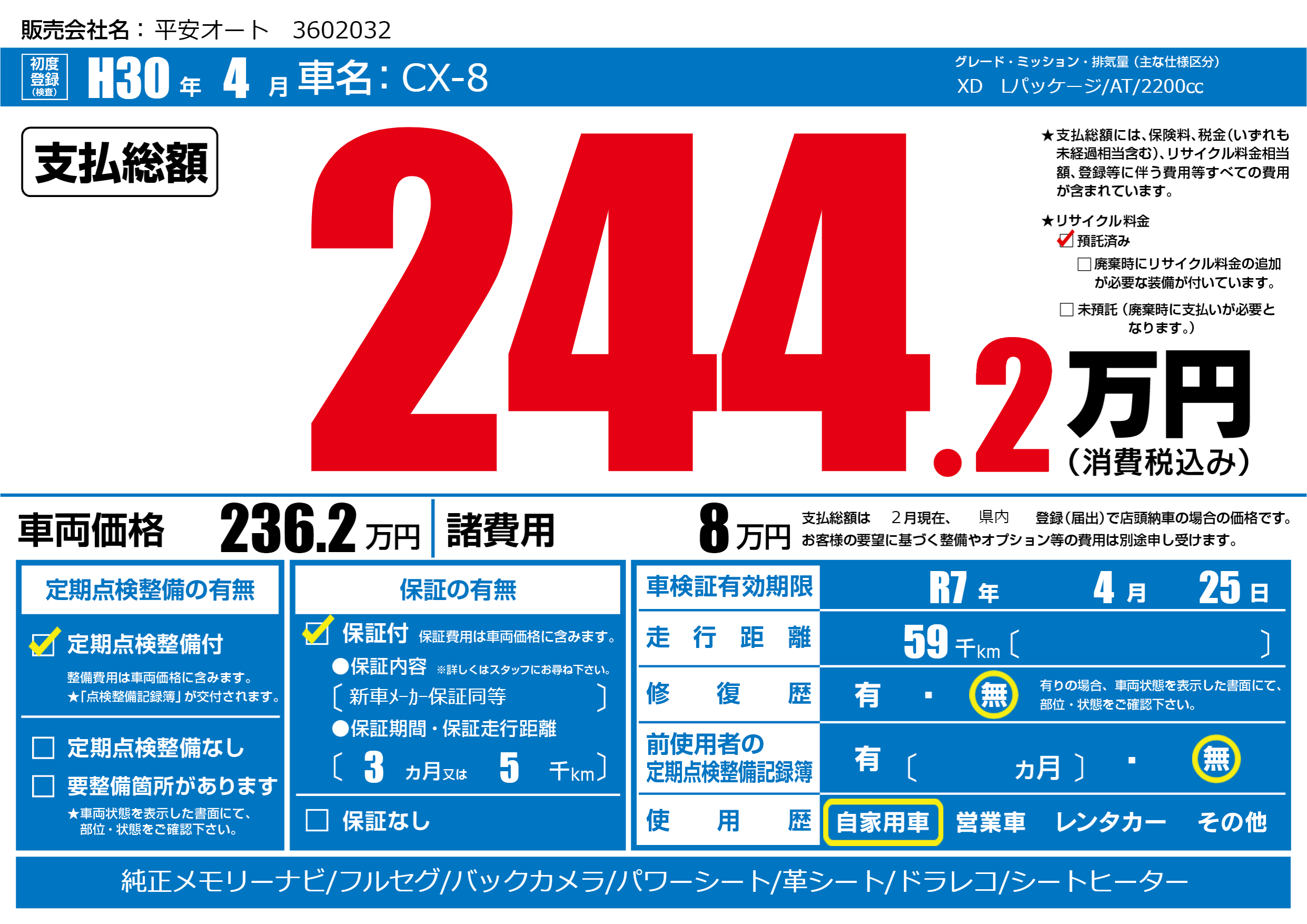 | 車名 | CX-8 | グレード ミッション 排気量 |