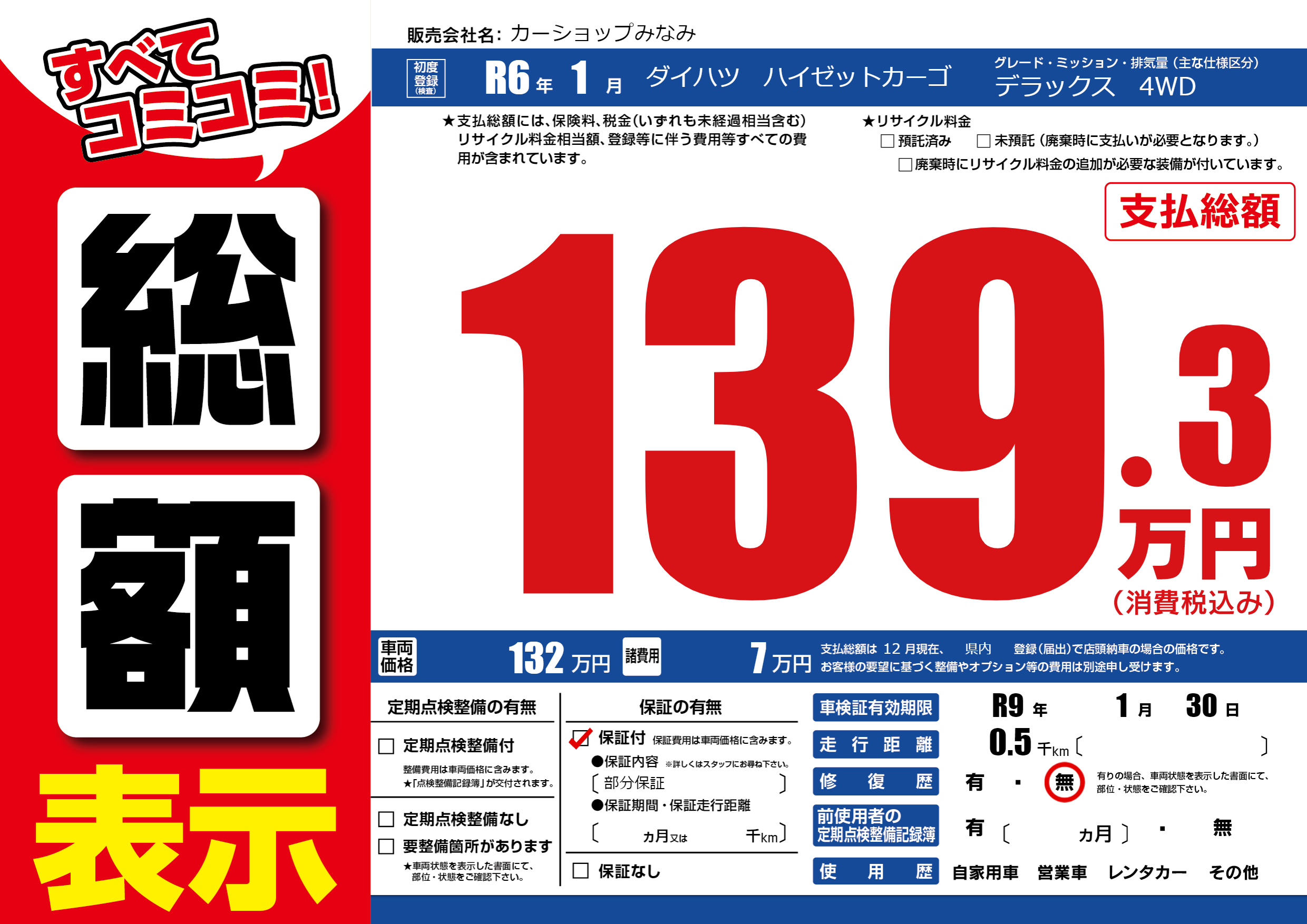 | 車名 | ダイハツ ハイゼットカーゴ | グレード ミッション 排気量 |