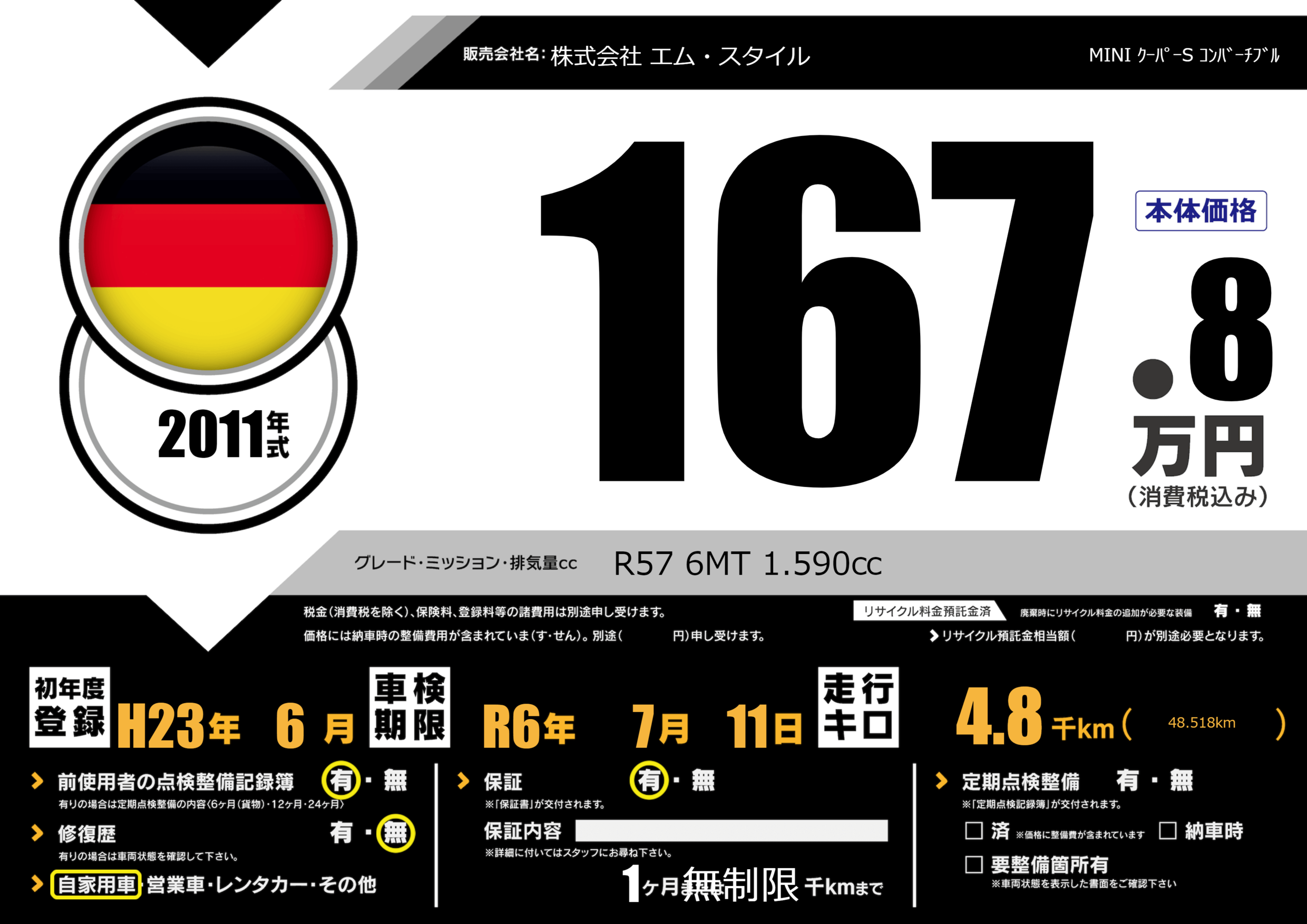 | 車名 | MINI クーパーS コンバーチブル | グレード ミッション 排気量 |
