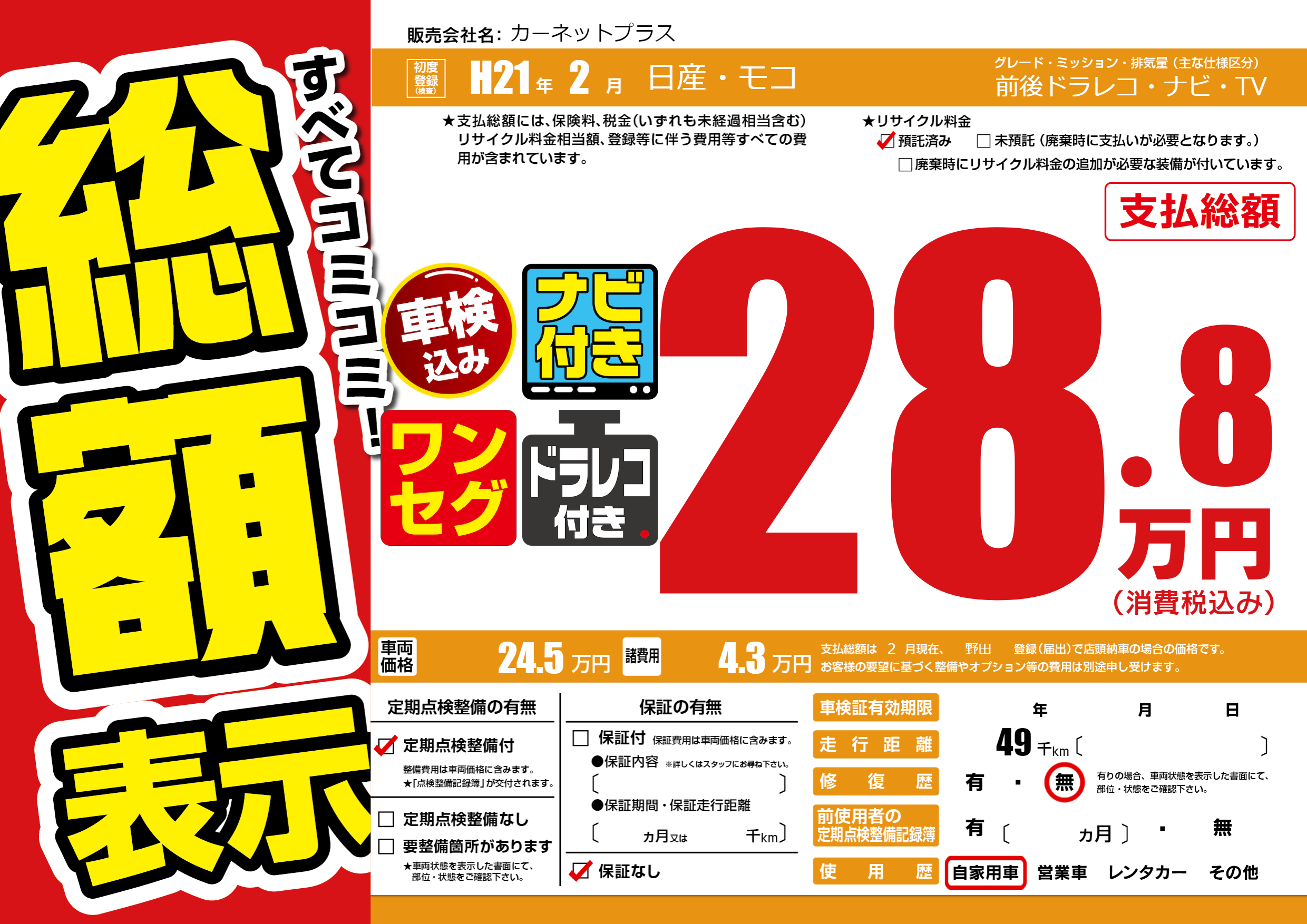 | 走行キロ | 4.9万km | 初年度登録 | H21年2月 |