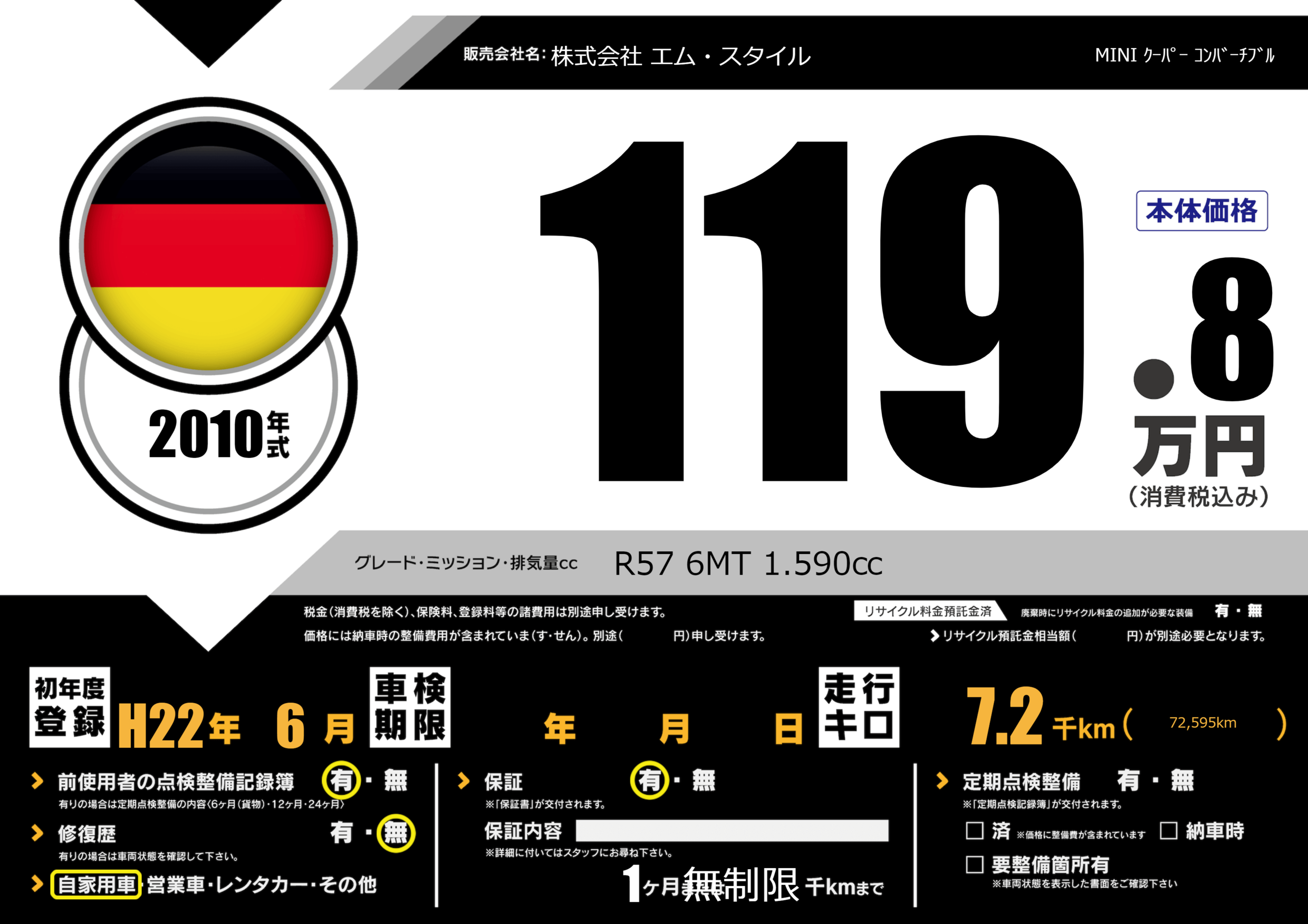 | 車名 | MINI クーパー コンバーチブル | グレード ミッション 排気量 |