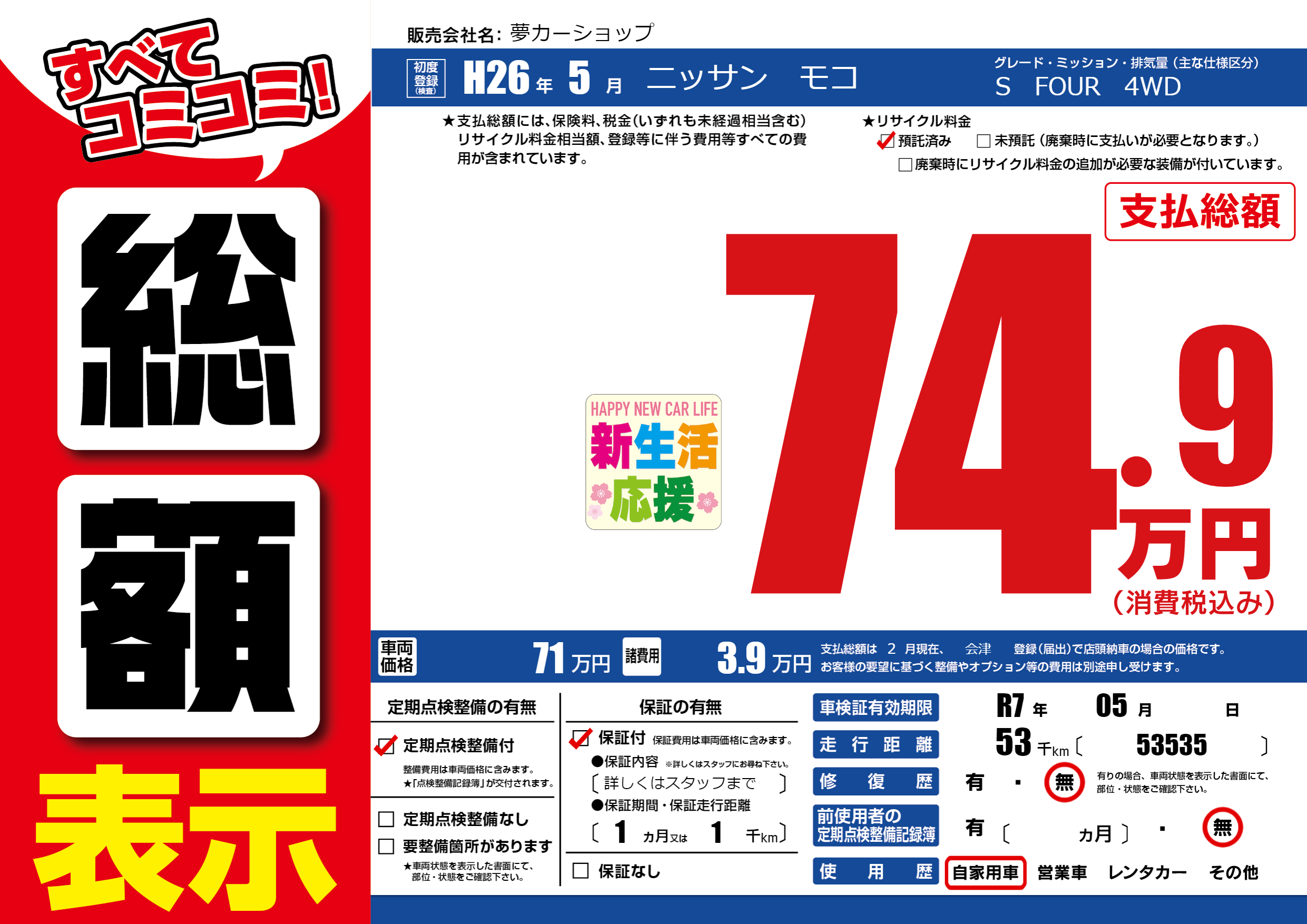 保証内容(詳しくはスタッフまで) 1ヶ月または1千km