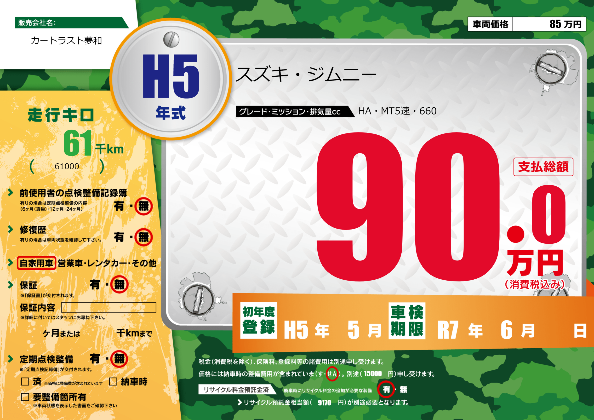 | 車検制限 | R7年 6月 - 日 | ||
