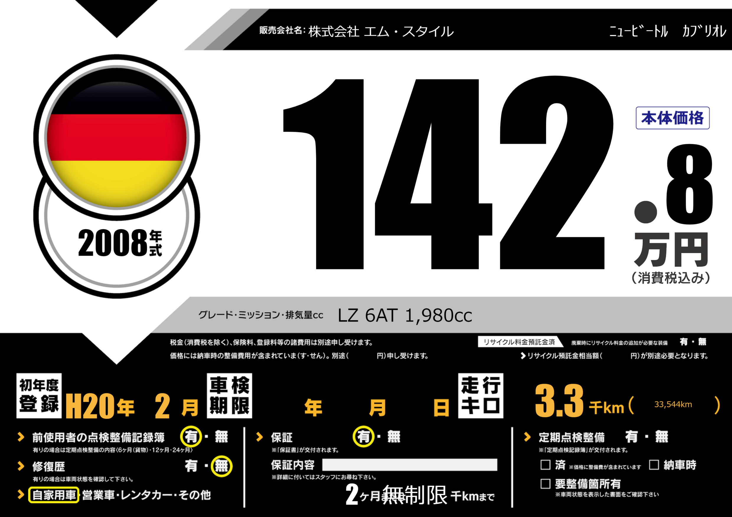 | 走行キロ | 0.3万km | 初年度登録 | H20年2月 |