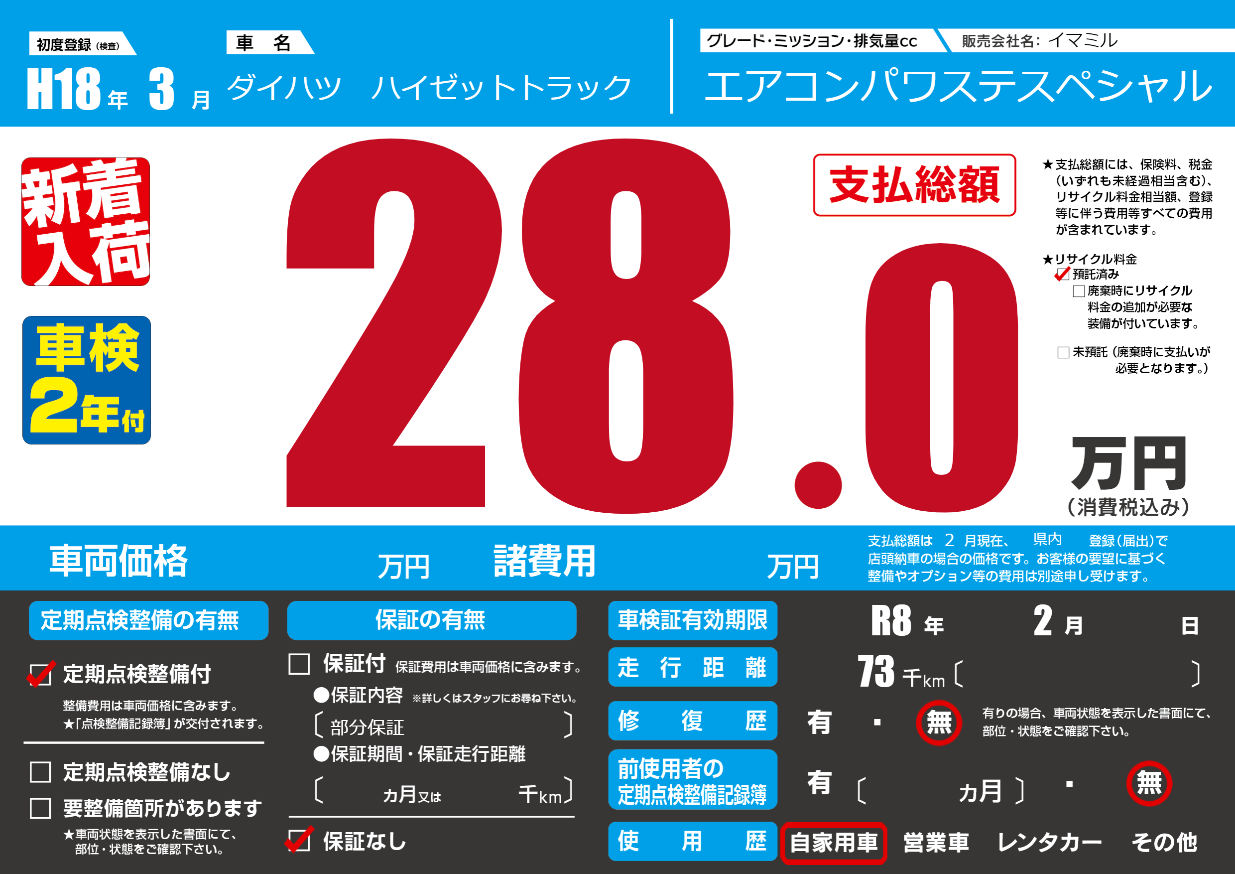 | 走行キロ | 7.3万km | 初年度登録 | H18年3月 |