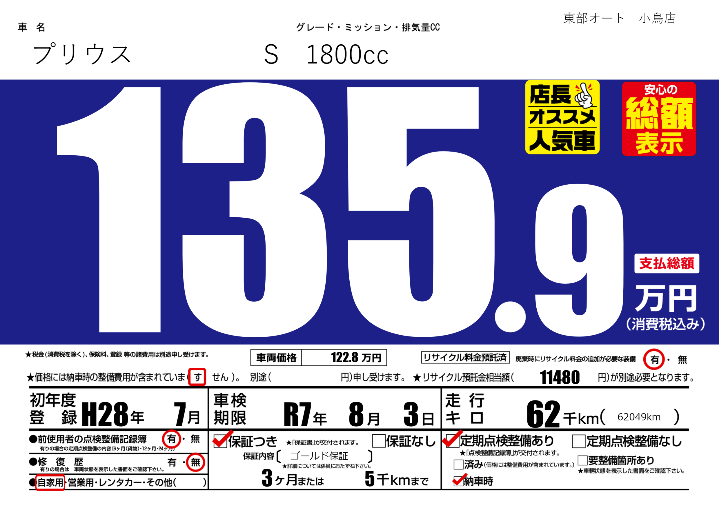 | 車名 | プリウス | グレード ミッション 排気量 |