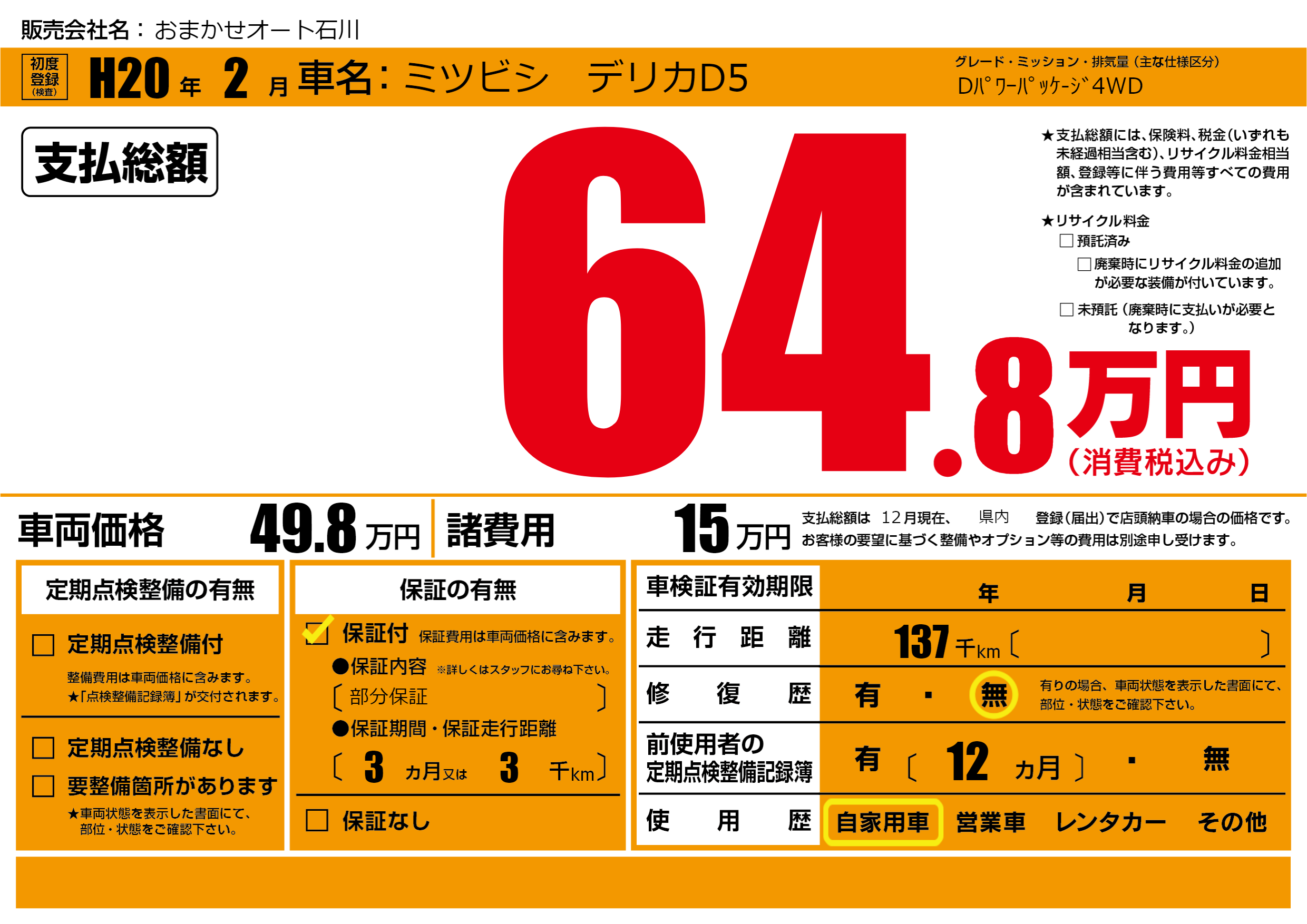 | 車名 | ミツビシ デリカD5 | グレード ミッション 排気量 |