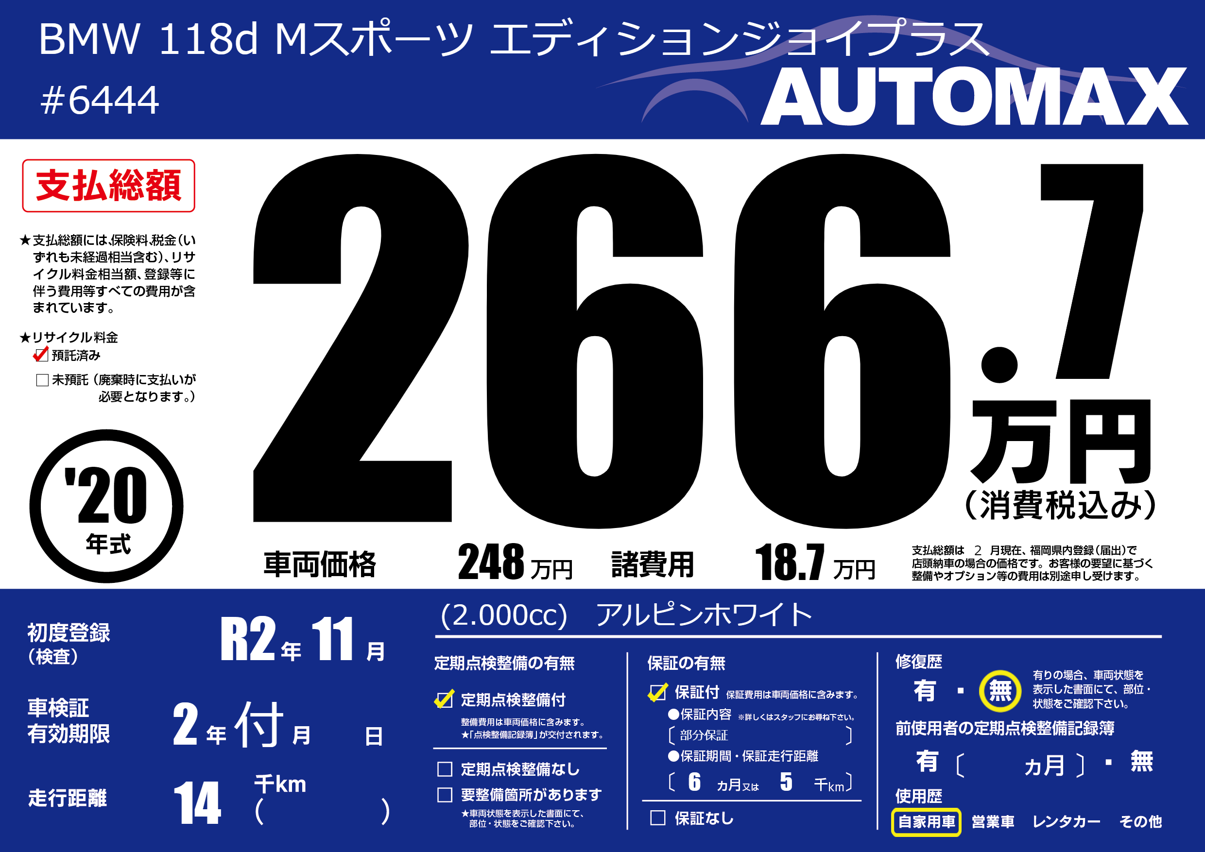 | 車名 | BMW 118d Mスポーツ エディションジョイプラス | グレード ミッション 排気量 |