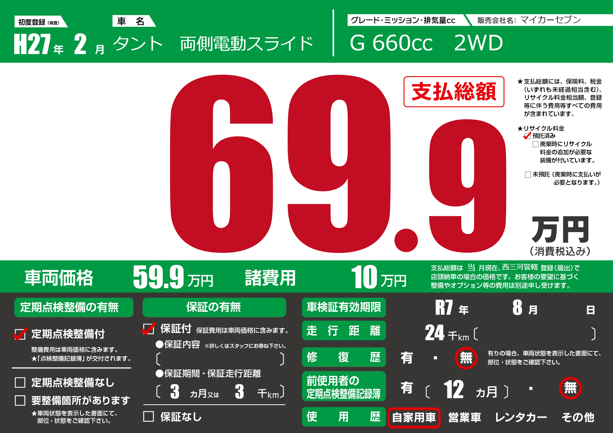 | 車名 | タント 両側電動スライド | グレード ミッション 排気量 |