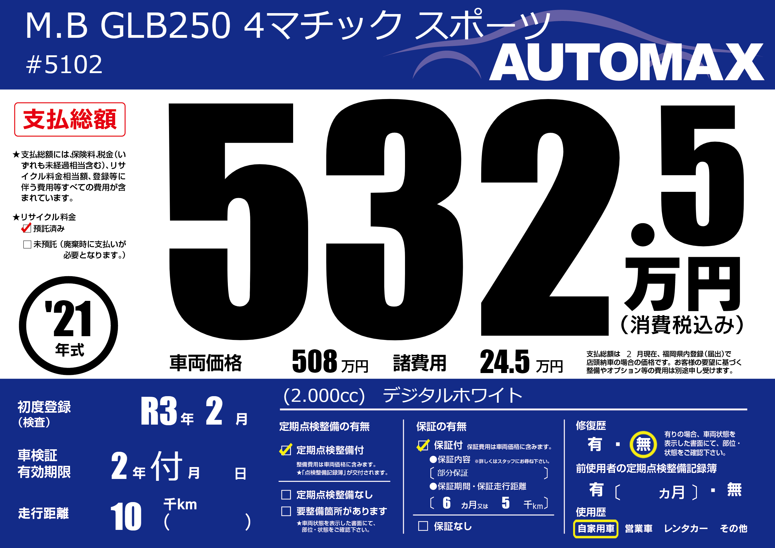 | 車名 | M.B GLB250 4マチック スポーツ | グレード ミッション 排気量 |