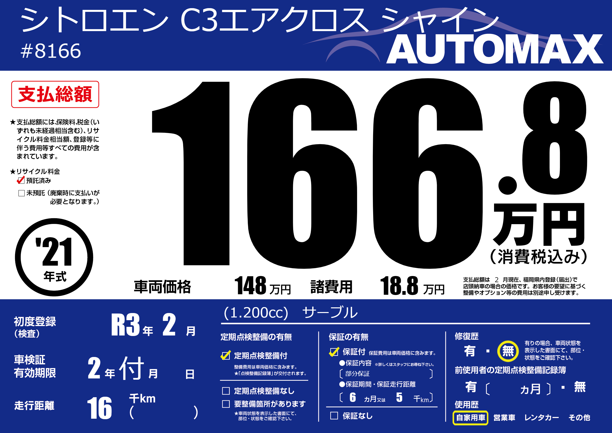 | 走行キロ | 1.6万km | 初年度登録 | R3年2月 |