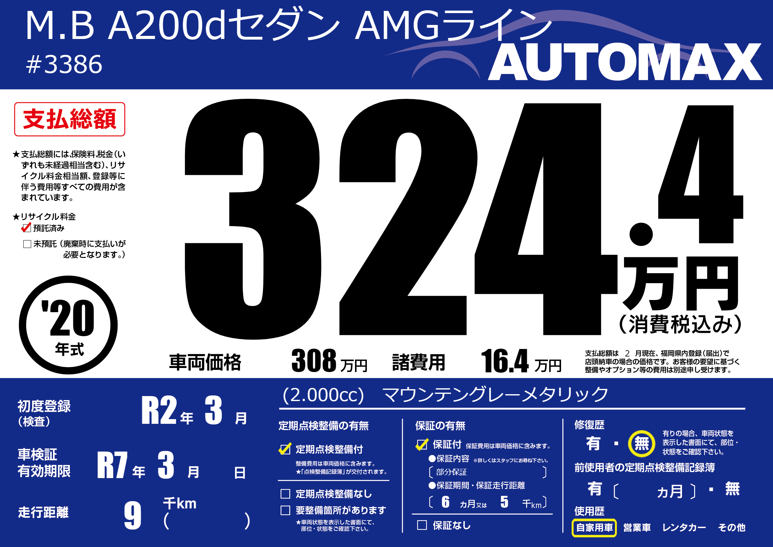 | 車名 | M.B A200dセダン AMGライン | グレード ミッション 排気量 |