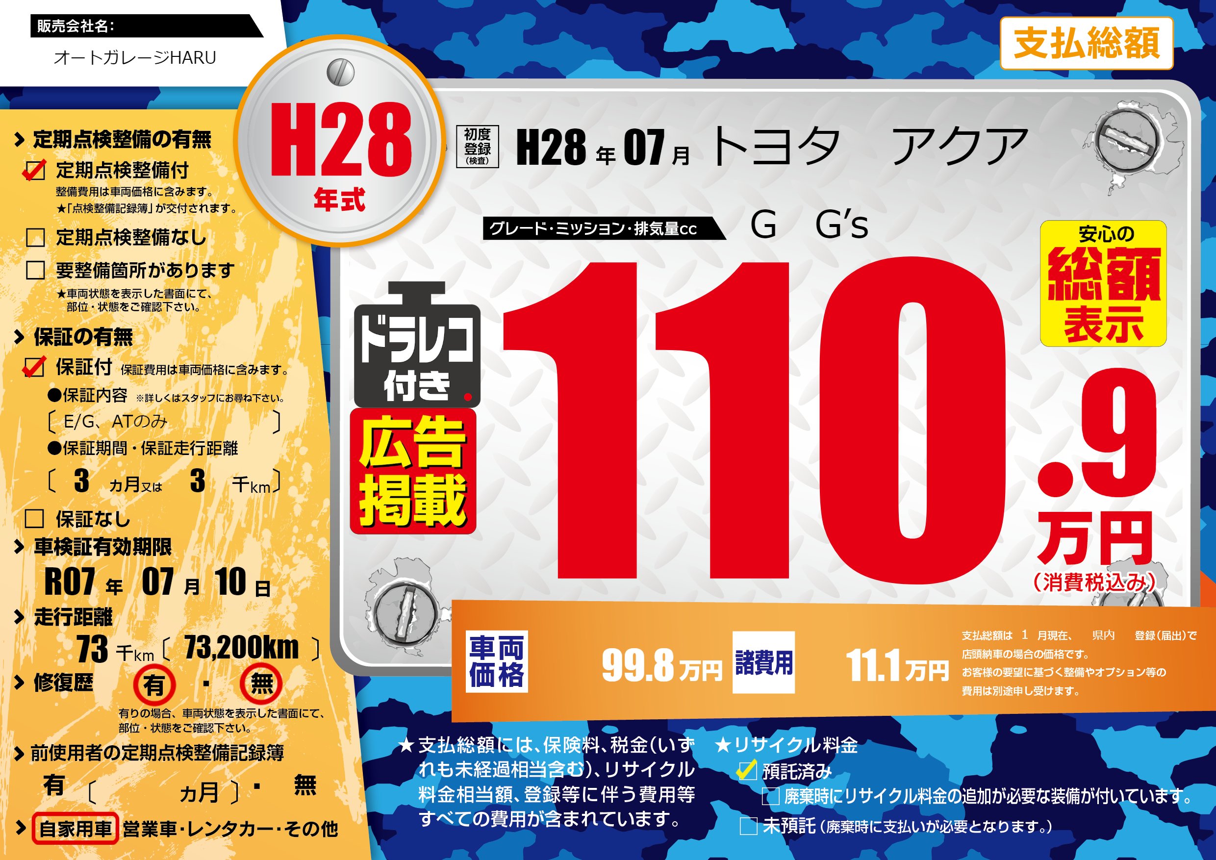 | 走行キロ | 7.3万km | 初年度登録 | H28年07月 |