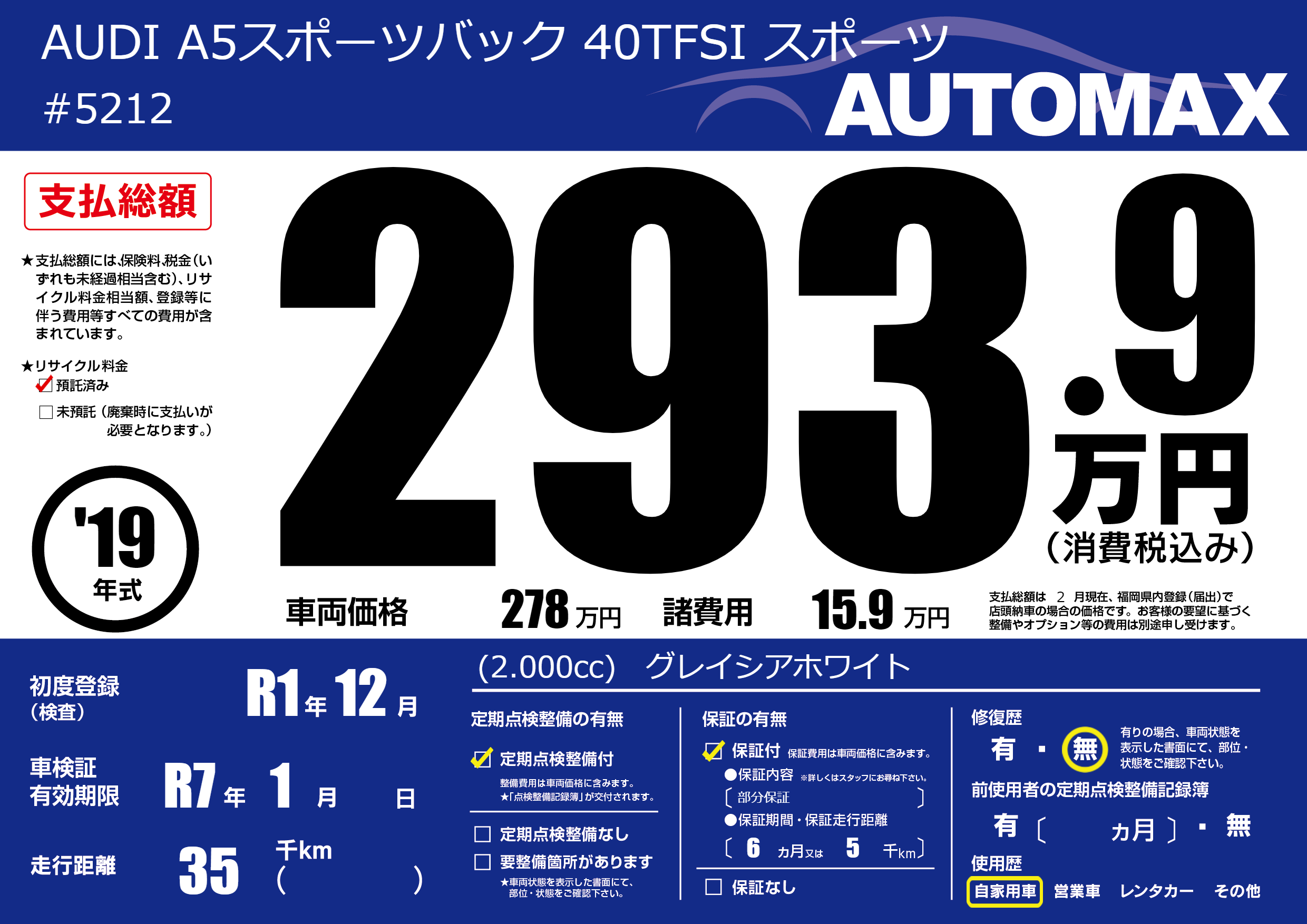 | 車名 | AUDI A5スポーツバック 40TFSI スポーツ | グレード ミッション 排気量 |