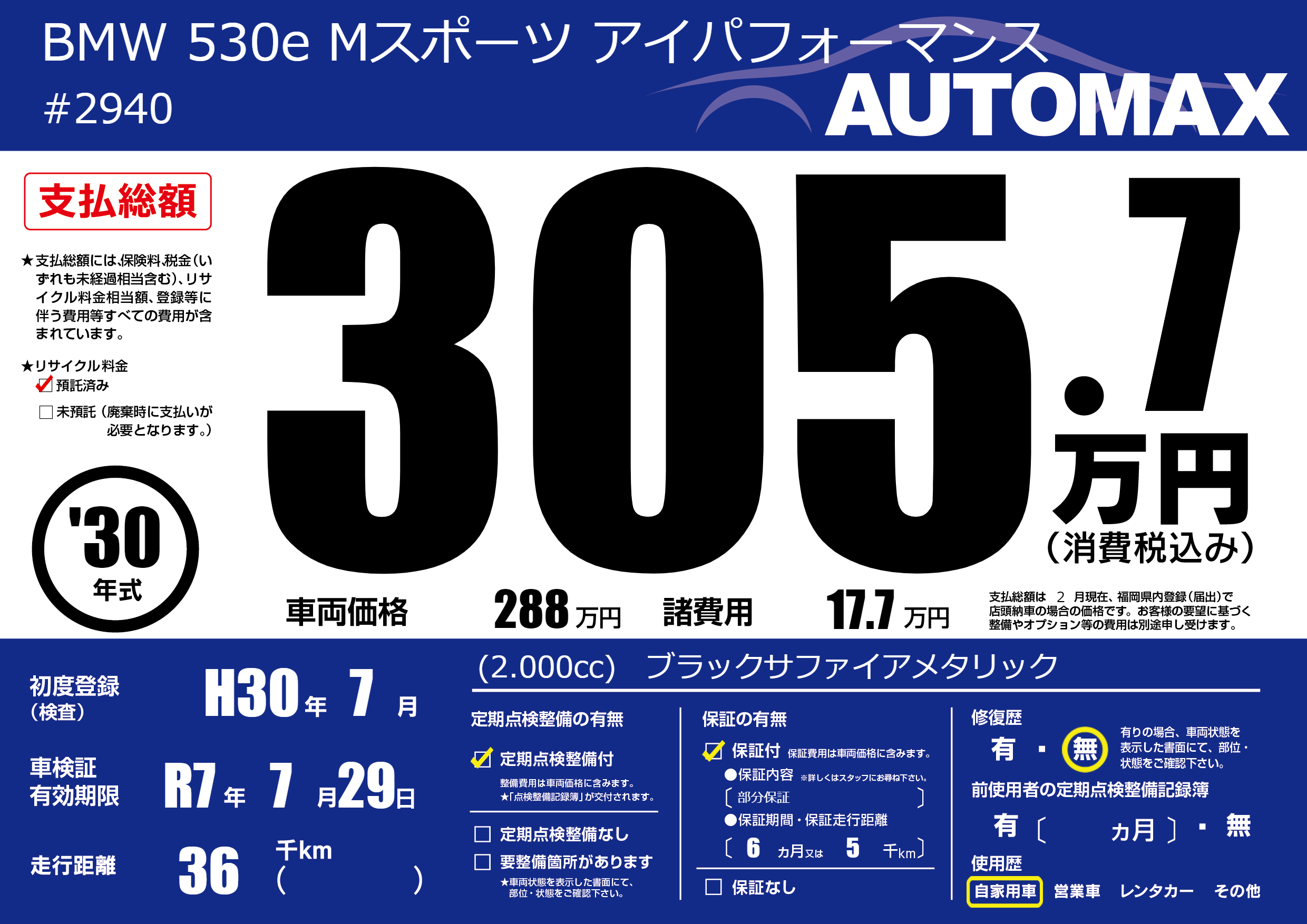 | 車名 | BMW 530e Mスポーツ アイパフォーマンス | グレード ミッション 排気量 |