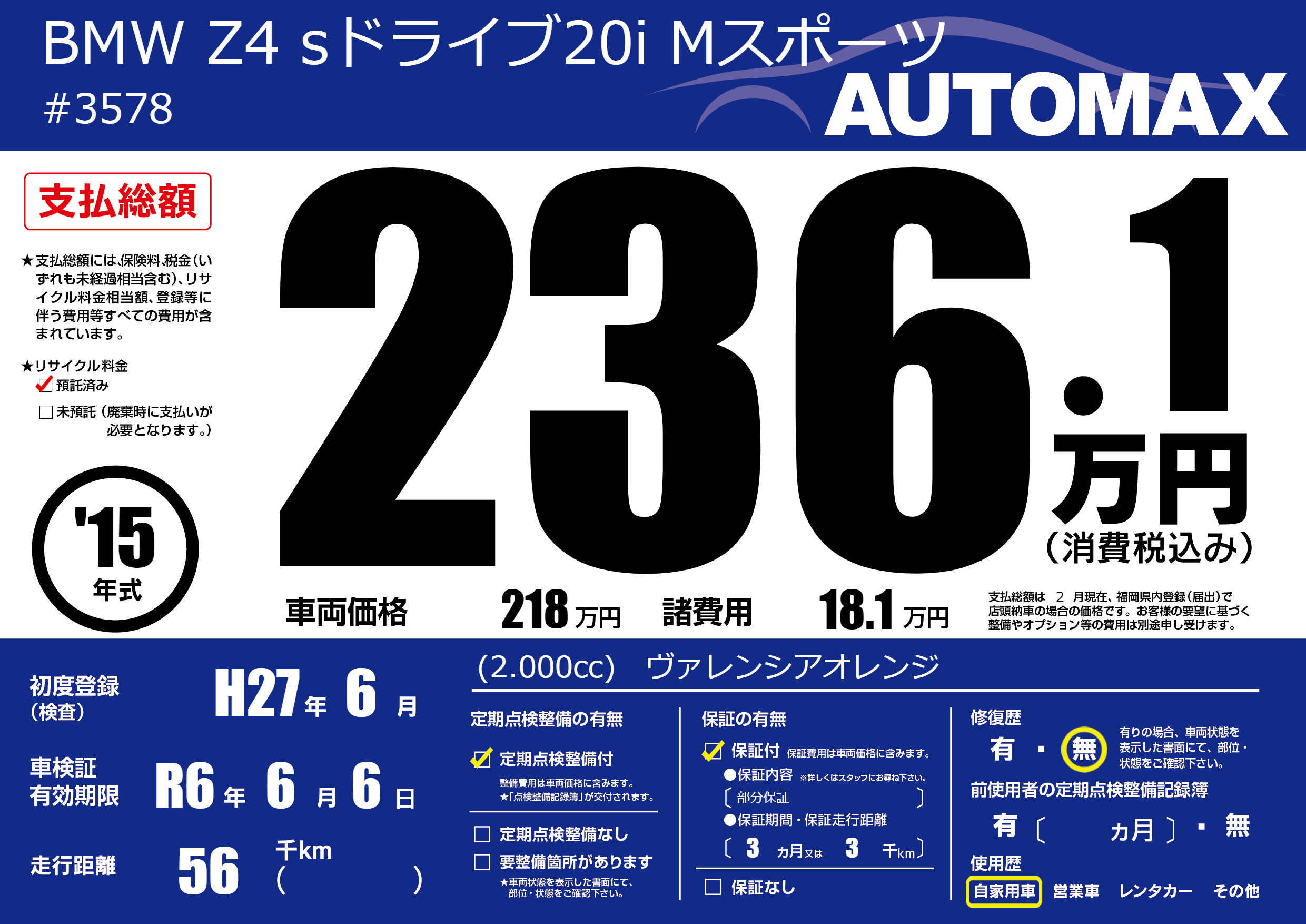 | 車名 | BMW Z4 sドライブ20i Mスポーツ | グレード ミッション 排気量 |
