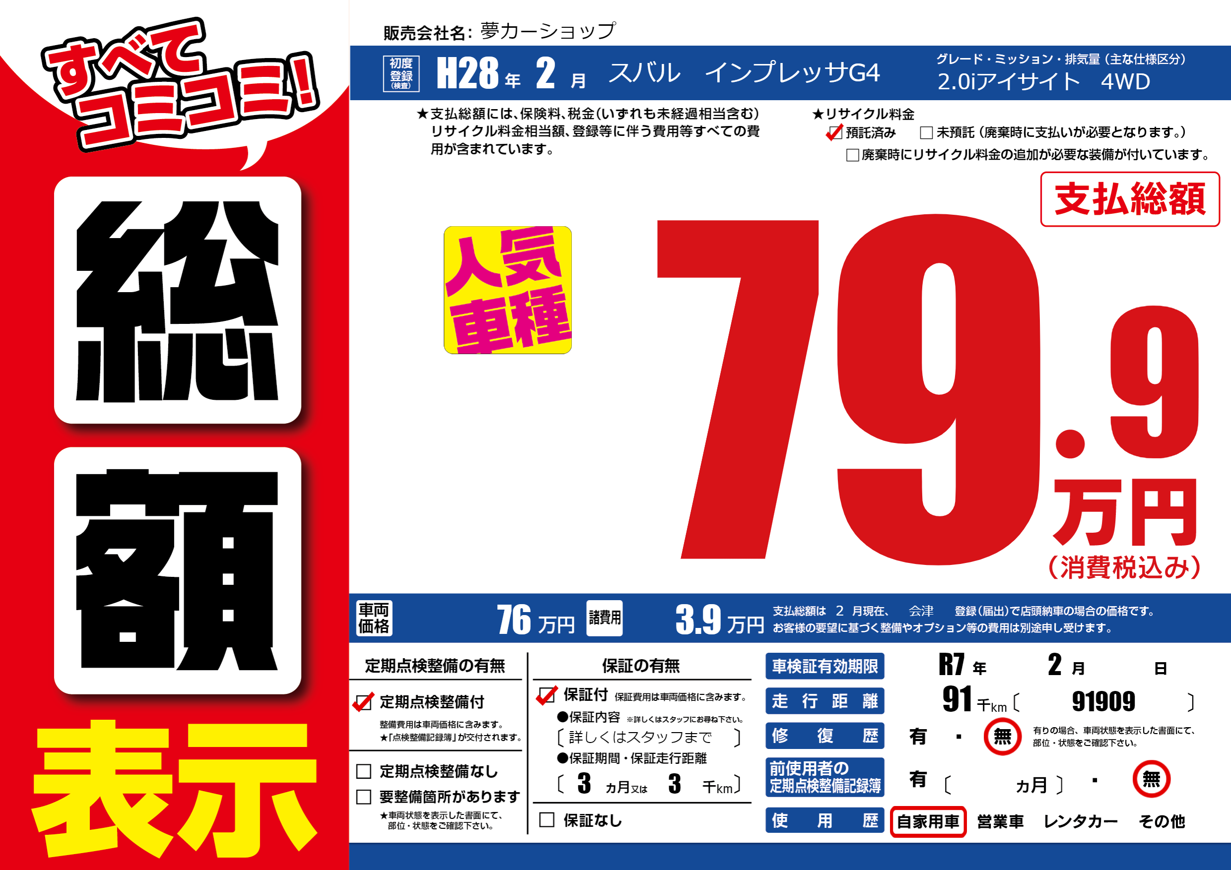 | 車名 | スバル インプレッサG4 | グレード ミッション 排気量 |