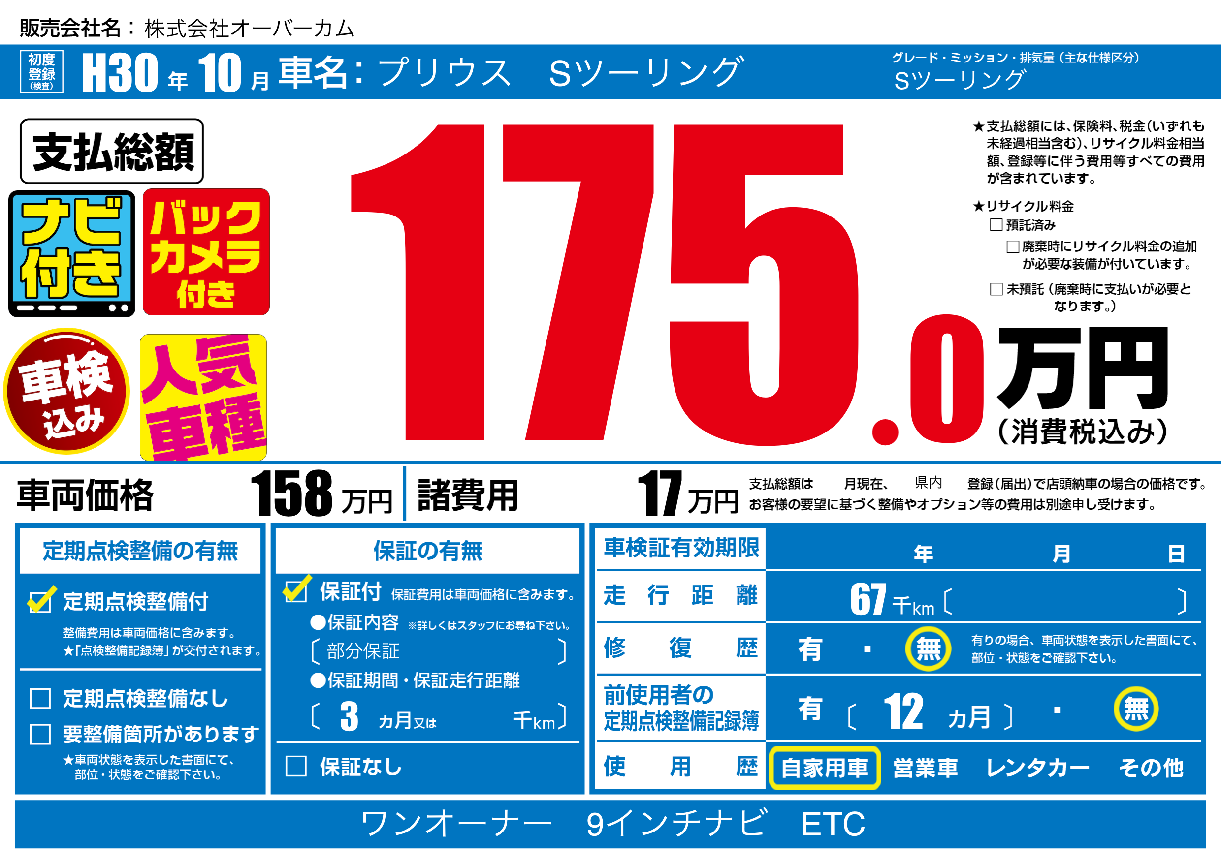 | 車名 | プリウス Sツーリング | グレード ミッション 排気量 |
