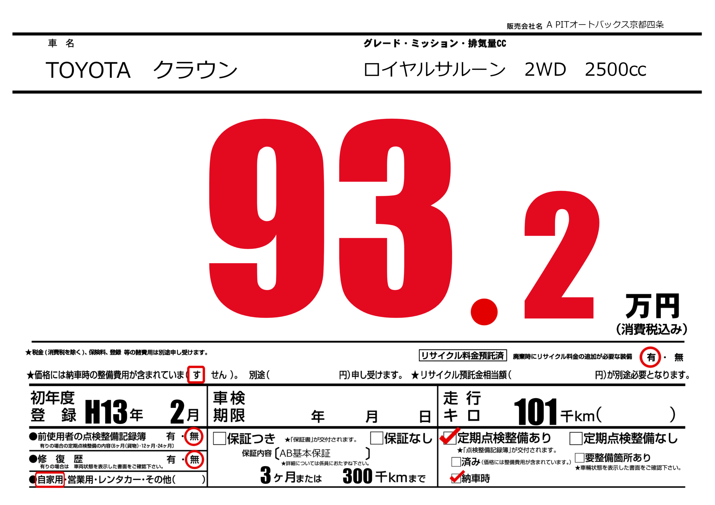保証なし 保証内容(AB基本保証) 3ヶ月または(300)千kmまで |