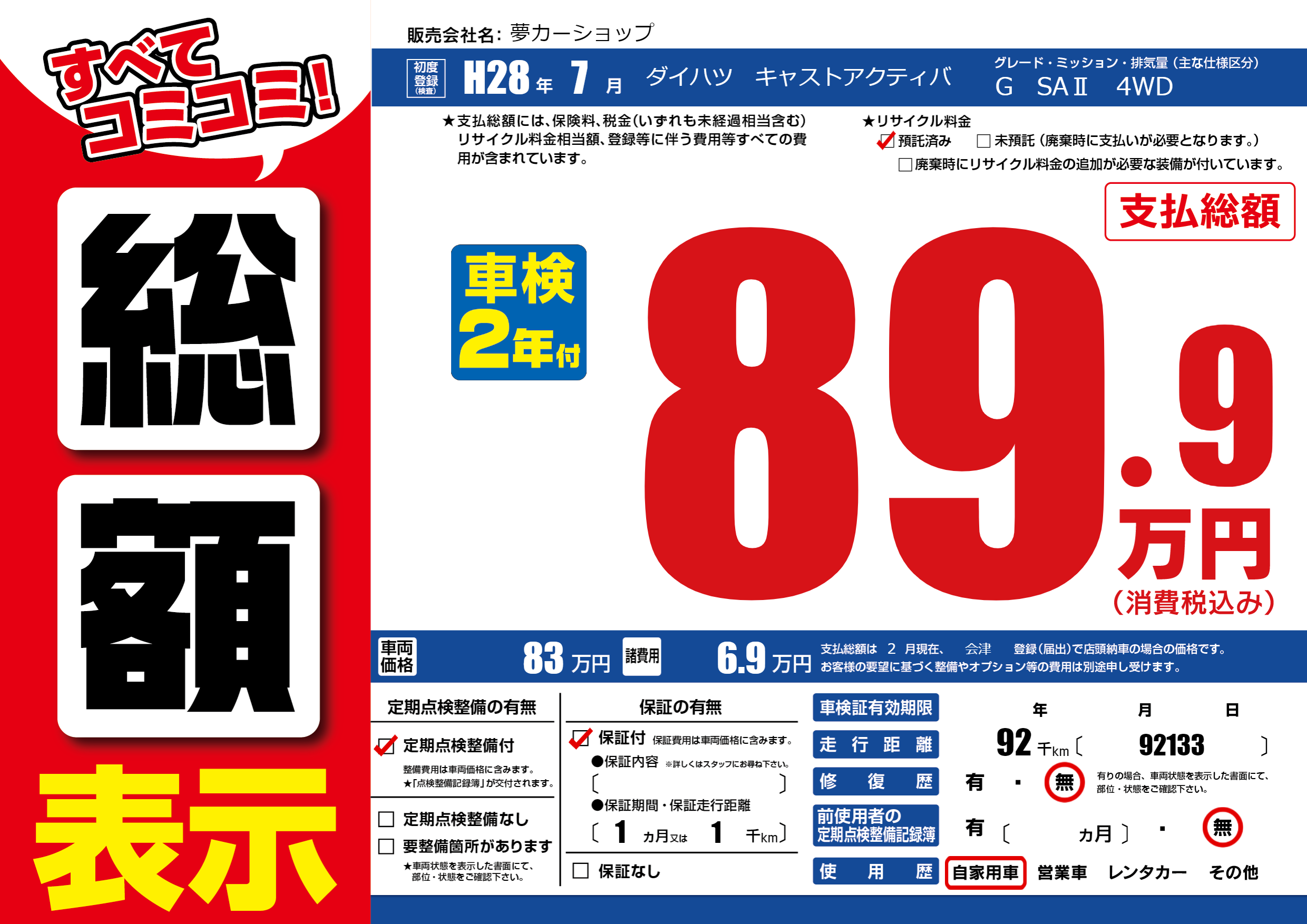 | 車名 | ダイハツ キャストアクティバ | グレード ミッション 排気量 |