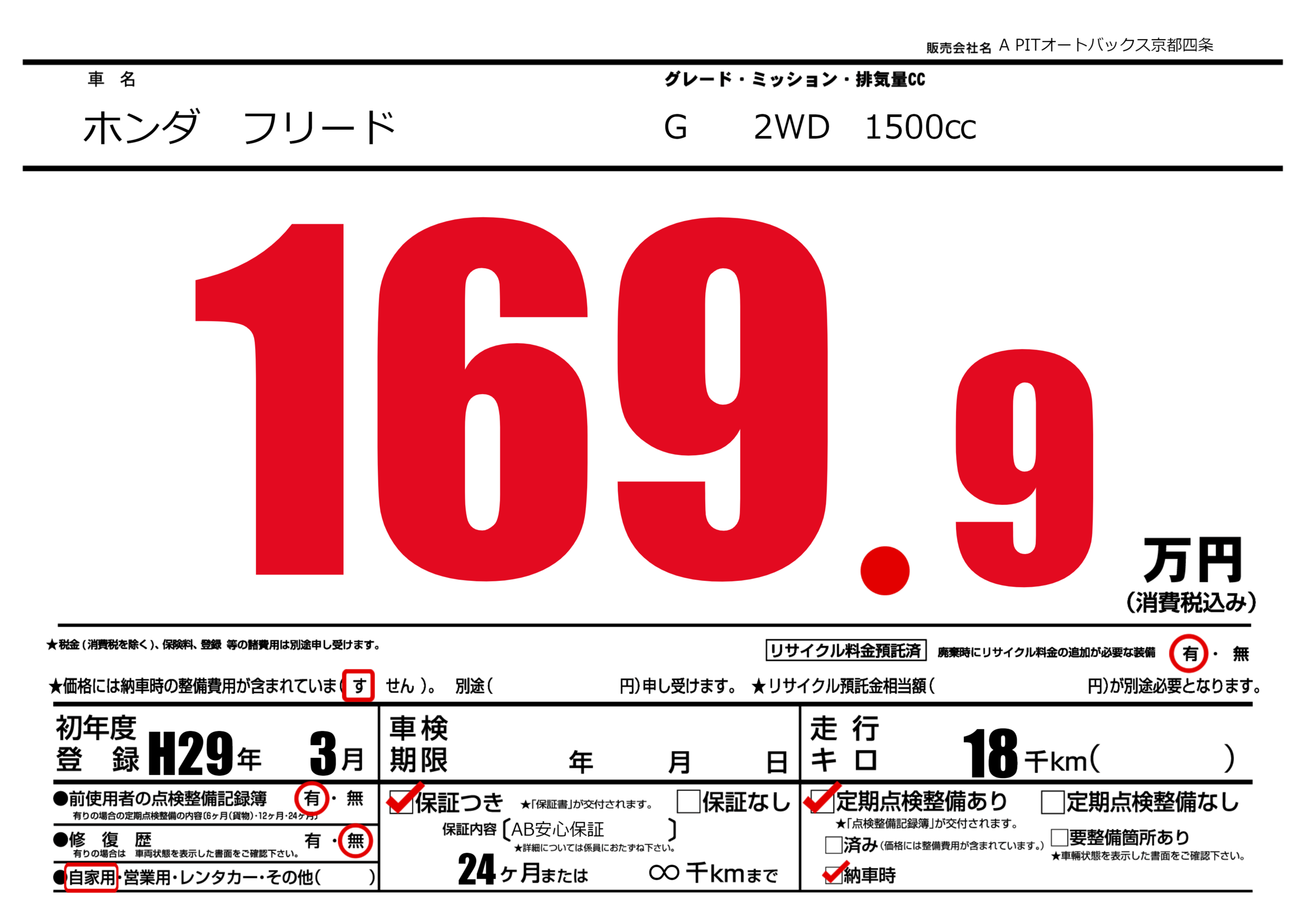 | 車名 | ホンダ フリード | グレード ミッション 排気量 |